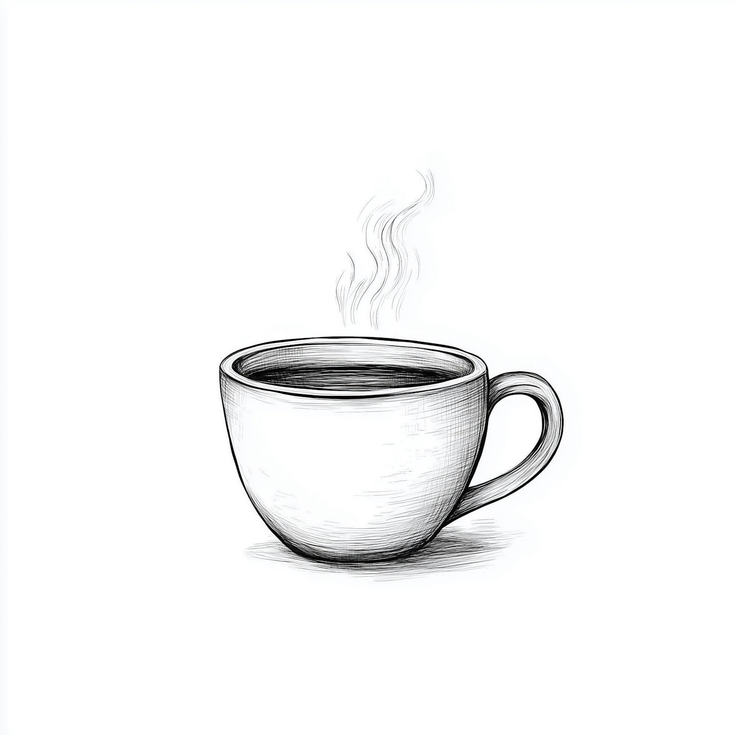 Minimalist black-and-white illustration of a steaming coffee cup with fine linework and a clean white background.
