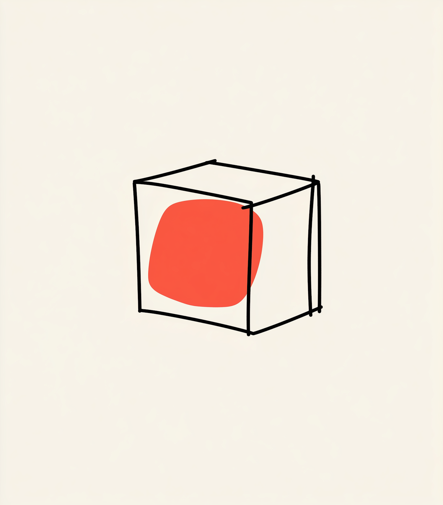 Minimalist illustration of a cube with a red shape inside, set against a light beige background. Simple and modern design.