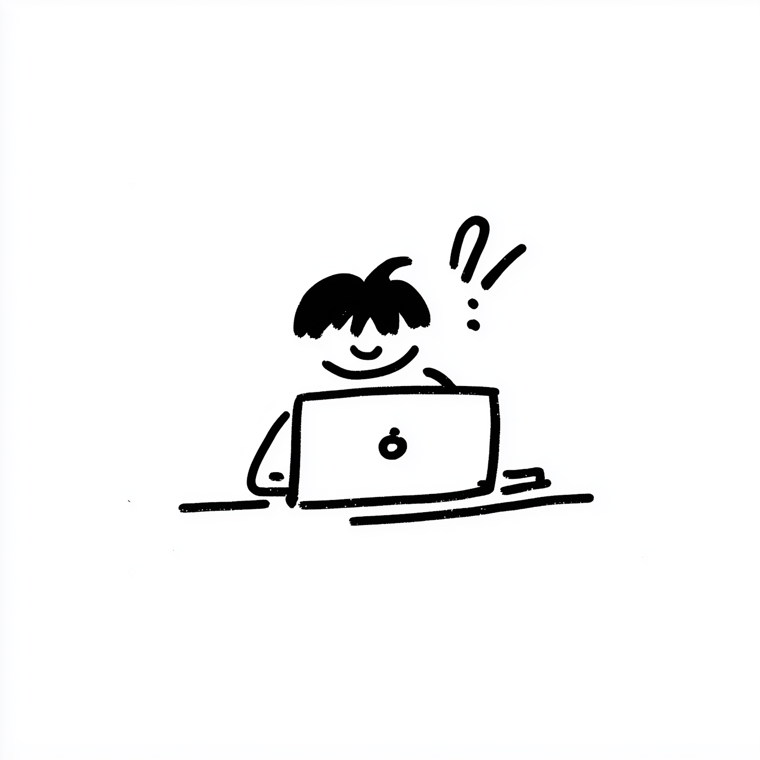 Minimalist black-and-white illustration of a person using a laptop, with a curious expression and punctuation marks above their head.