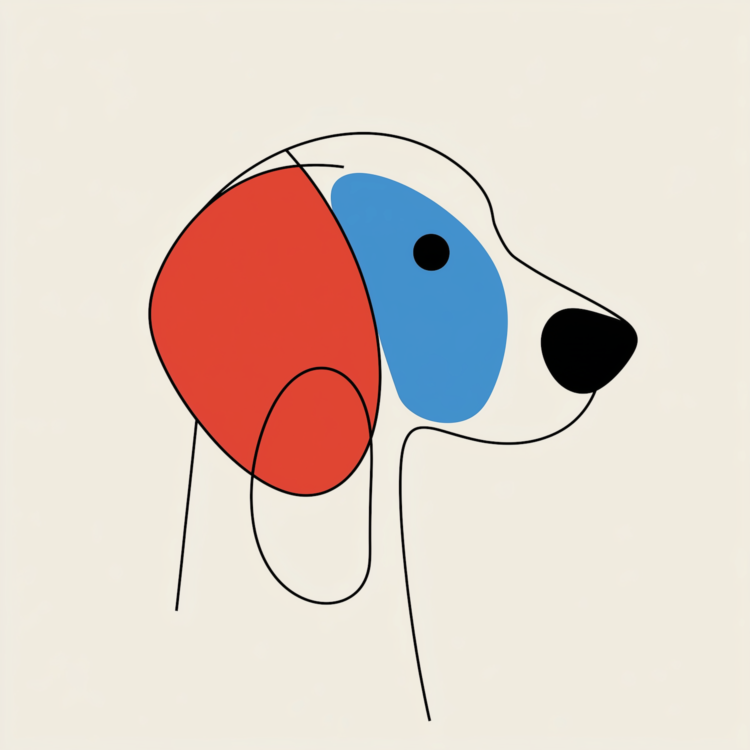 Minimalist dog illustration with bold red and blue shapes on an off-white background, highlighting abstract design elements.