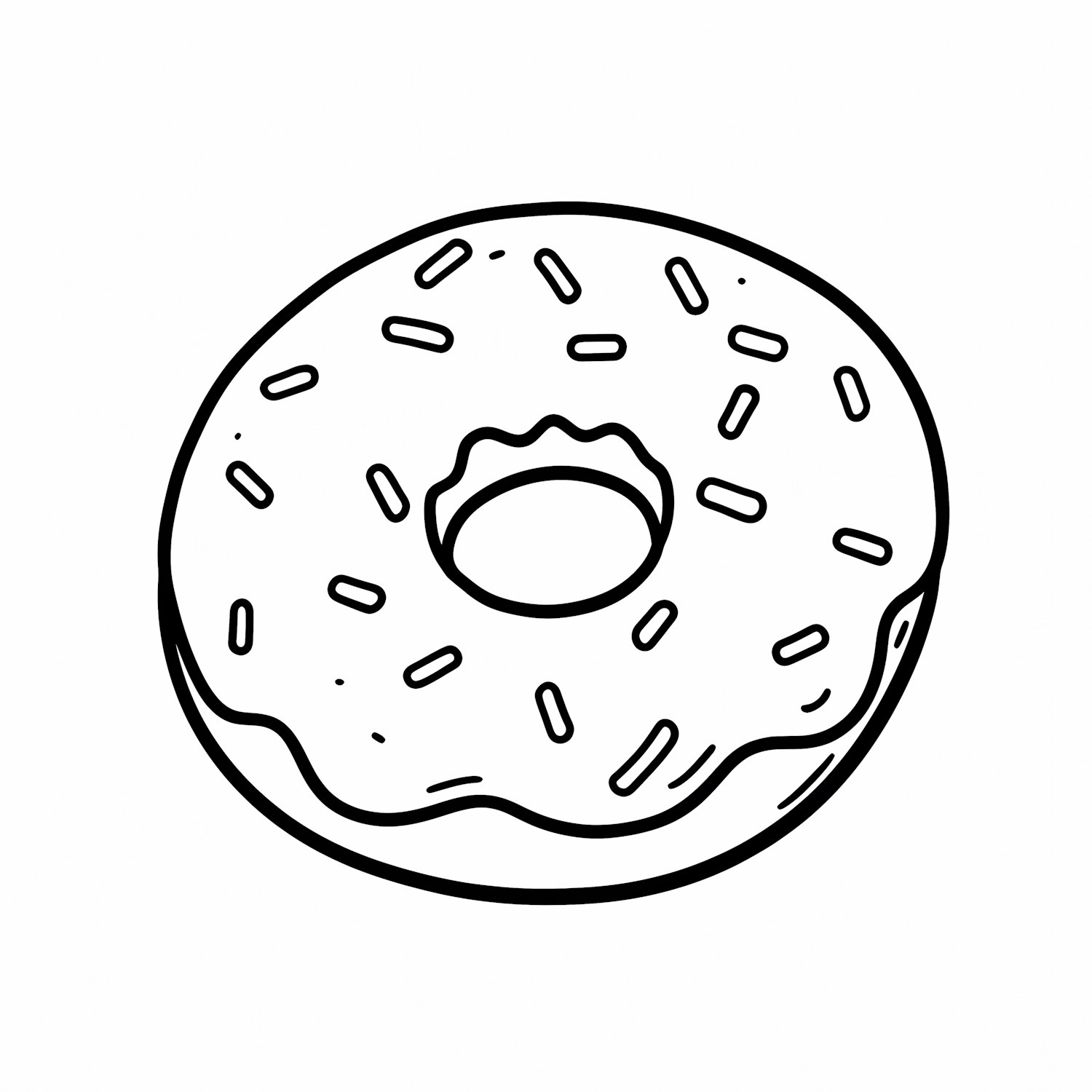 A clean black-and-white line drawing of a donut with glaze and sprinkles, perfect for coloring or design projects.