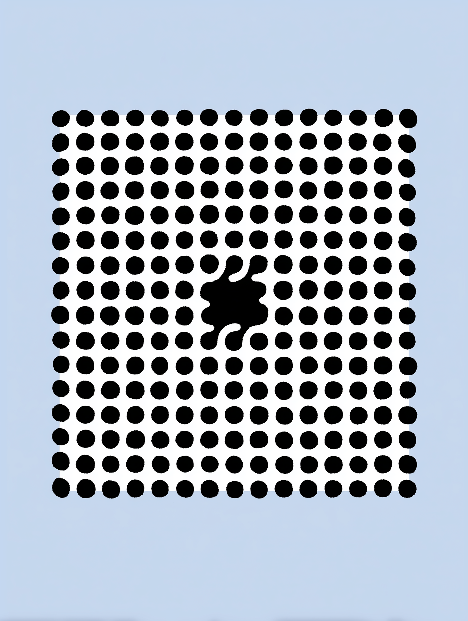 Minimalist grid of black dots on white with an irregular black splotch in the center, set against a light blue background.