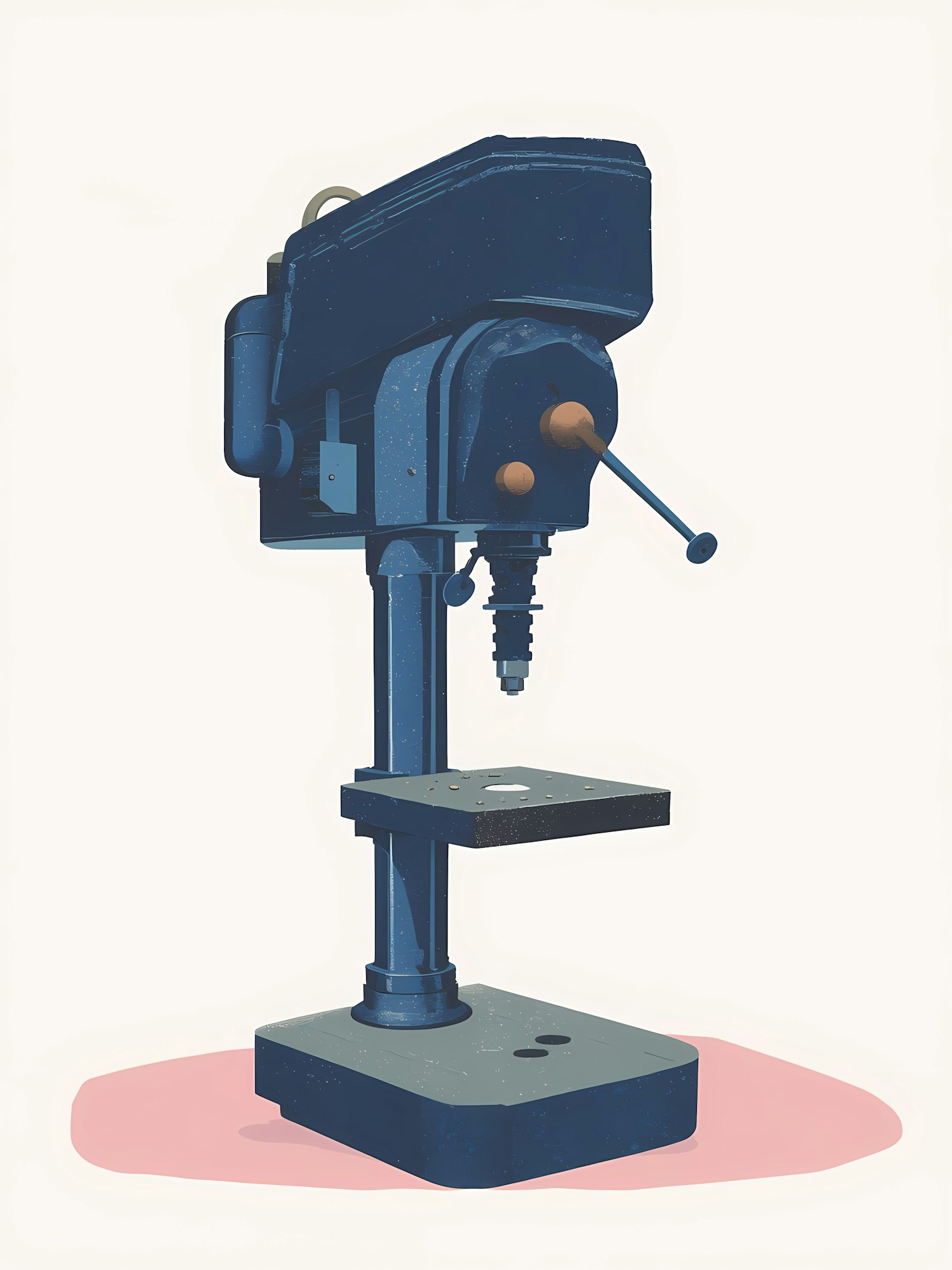 Stylized illustration of a blue drill press with a minimalist design, set against a clean background with a soft pink shadow.