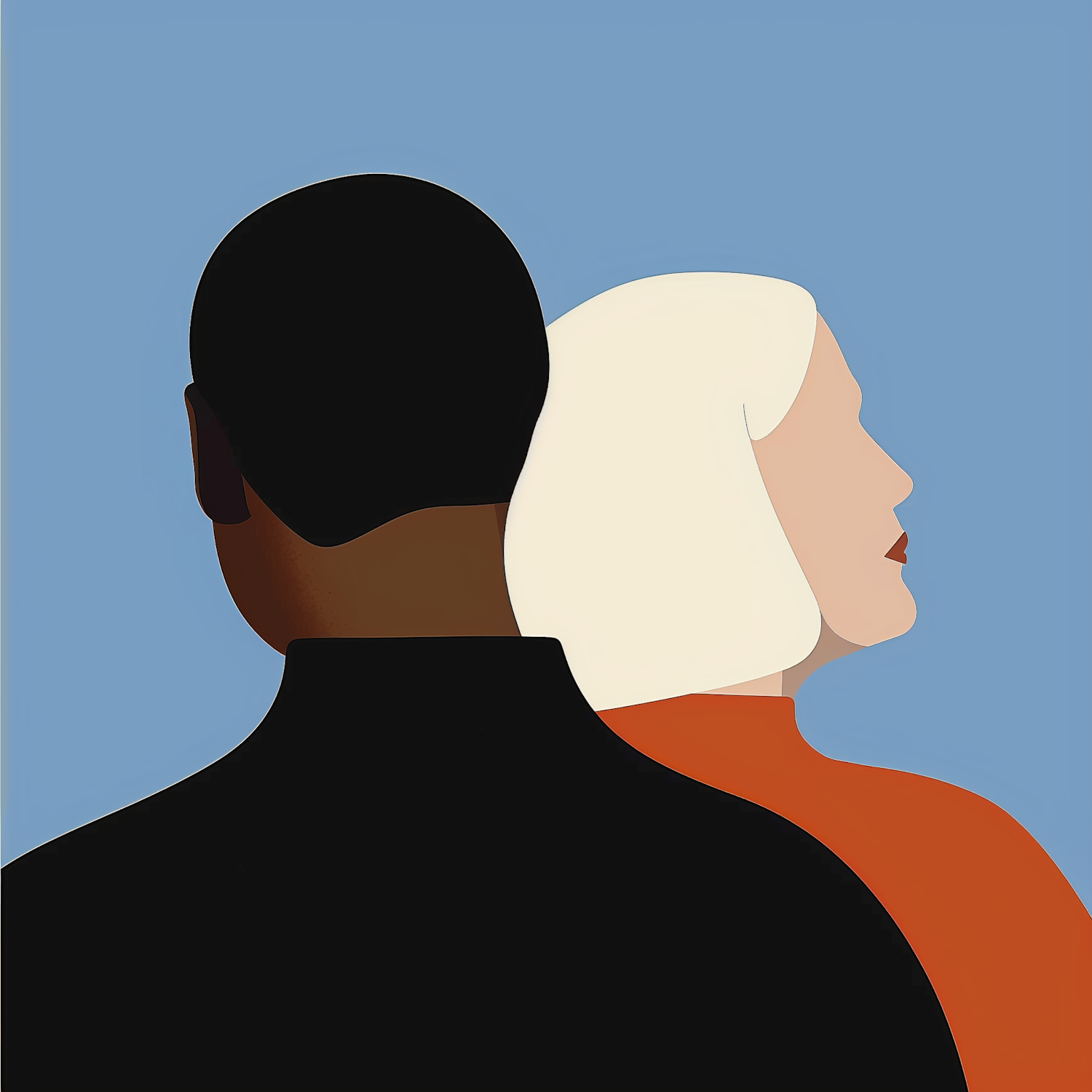 Minimalist illustration of two people back-to-back, one with dark skin in black and the other with light skin and white hair in orange, on a blue background.