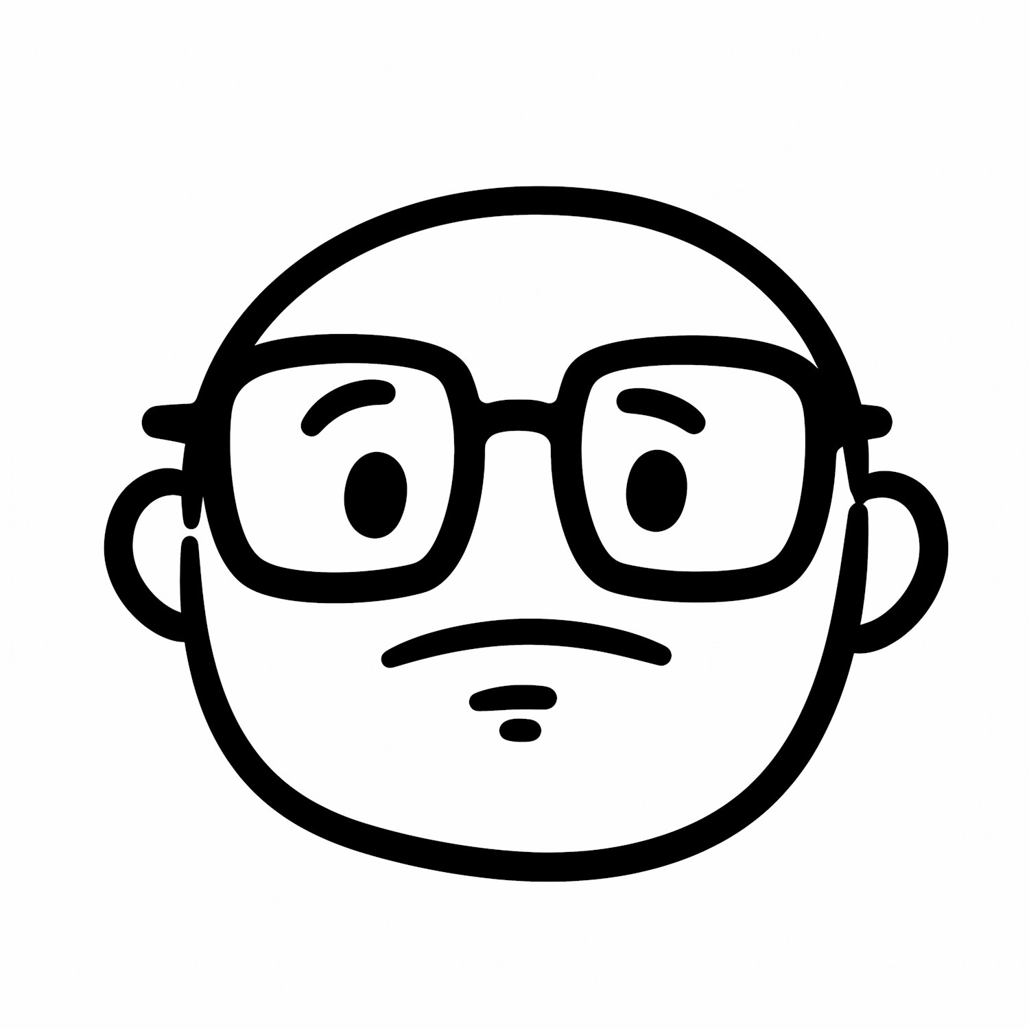 Minimalist cartoon face with glasses and a neutral expression, drawn in bold black lines on a white background.