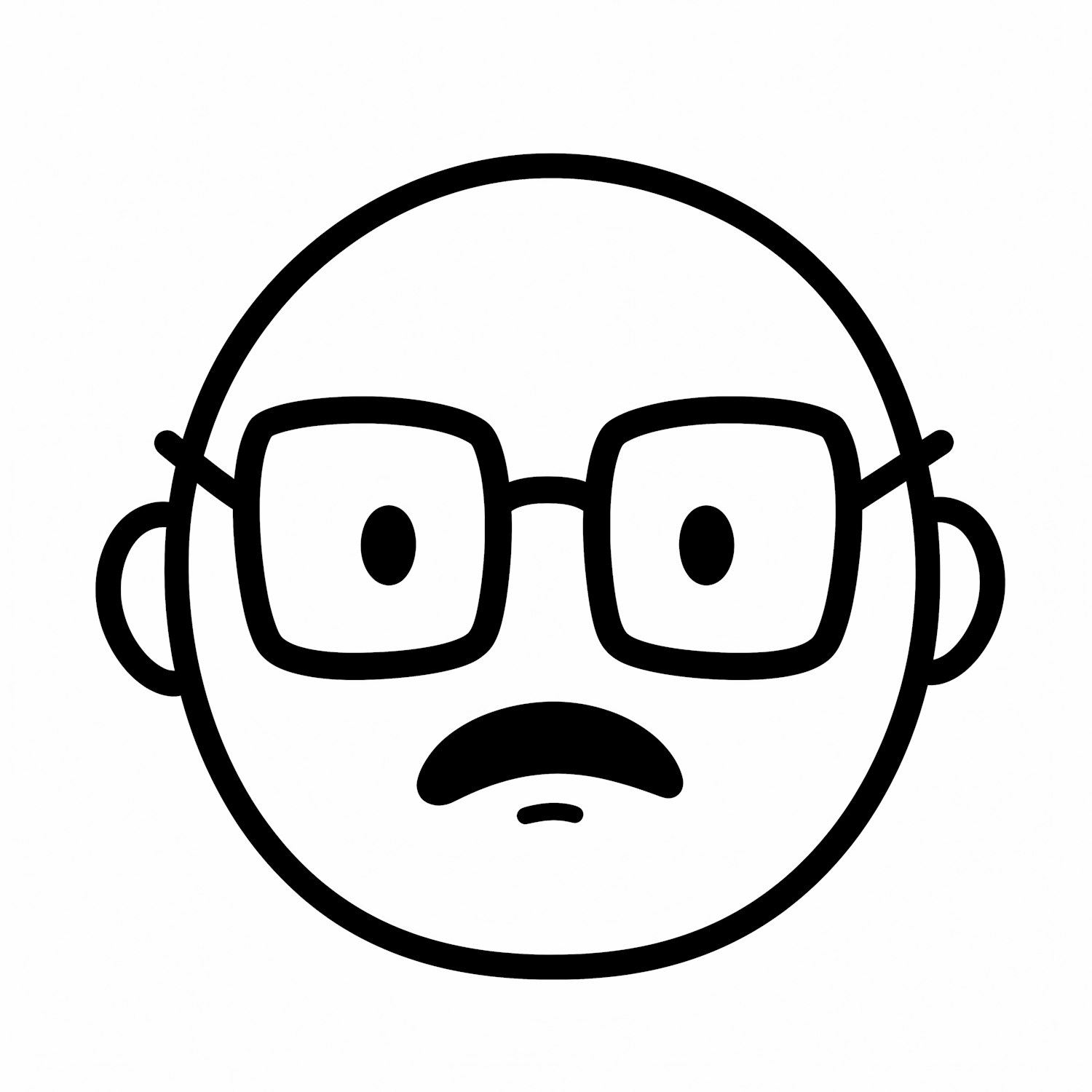 Minimalistic black-and-white line art of a face with glasses, a mustache, and a bald head, featuring a neutral expression.