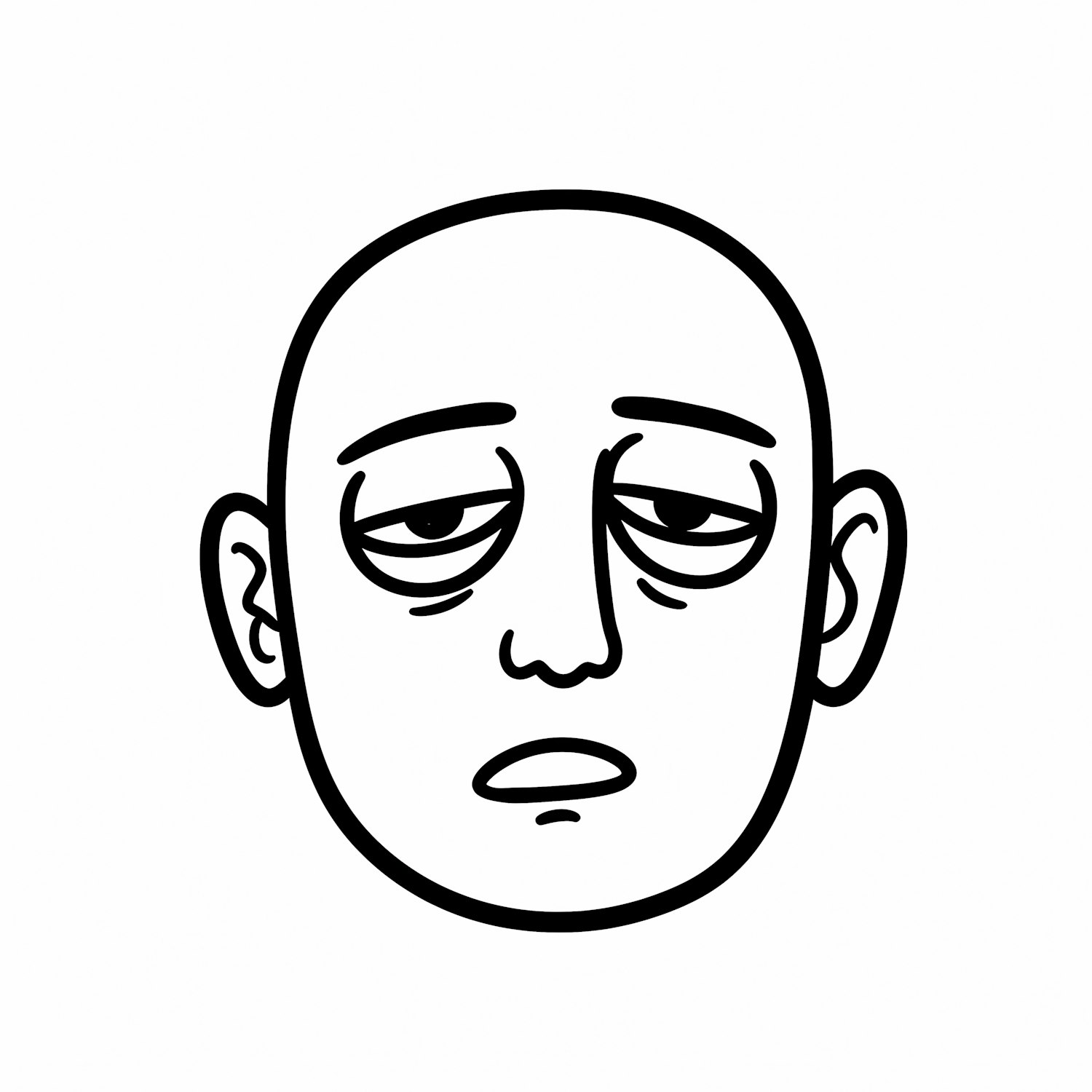 Minimalistic black-and-white illustration of a tired-looking face with droopy eyes and a neutral expression on a plain white background.