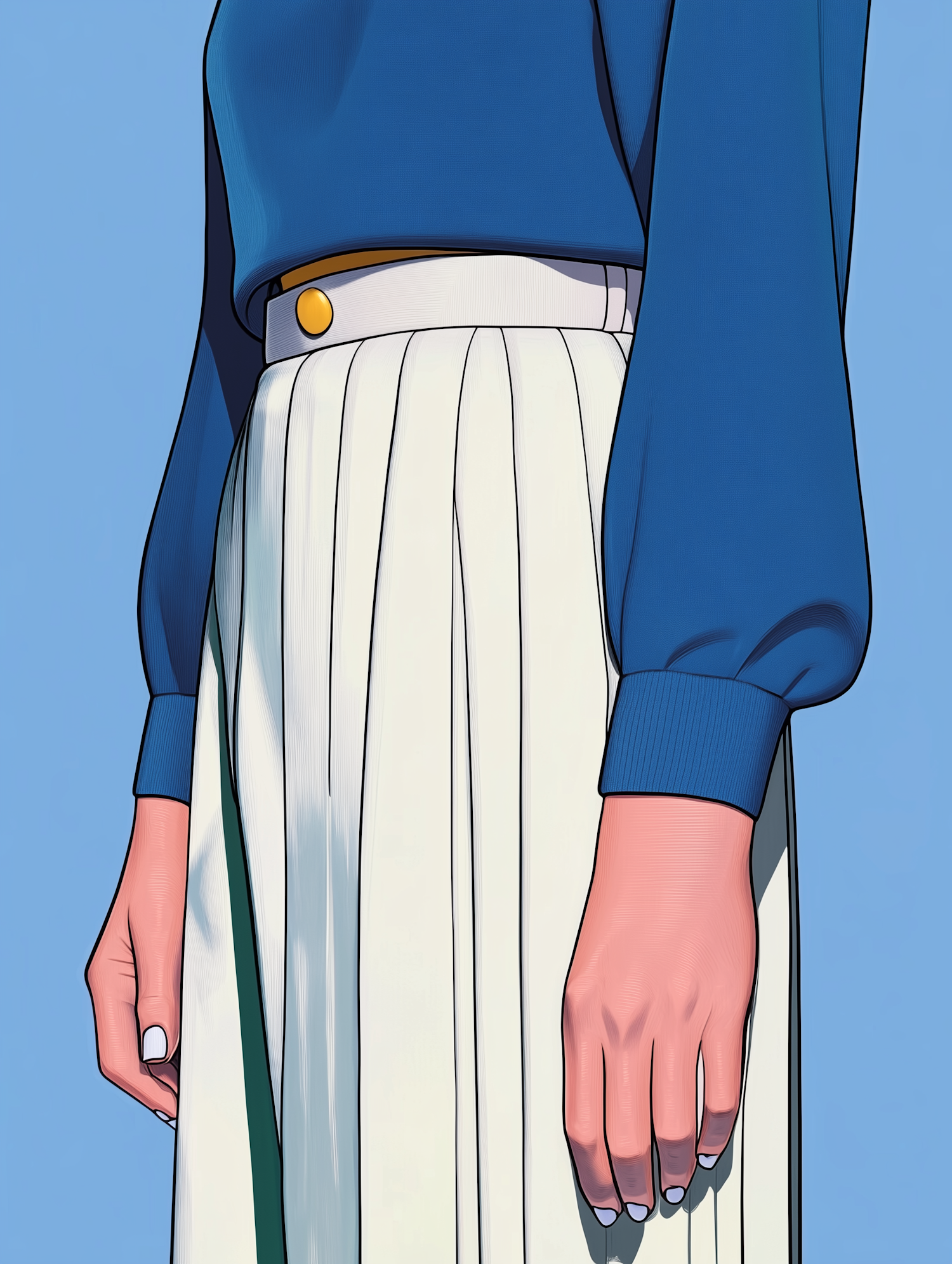 Stylish outfit with a blue top and white pleated skirt, highlighted by a yellow button belt. Minimalist and elegant fashion illustration.