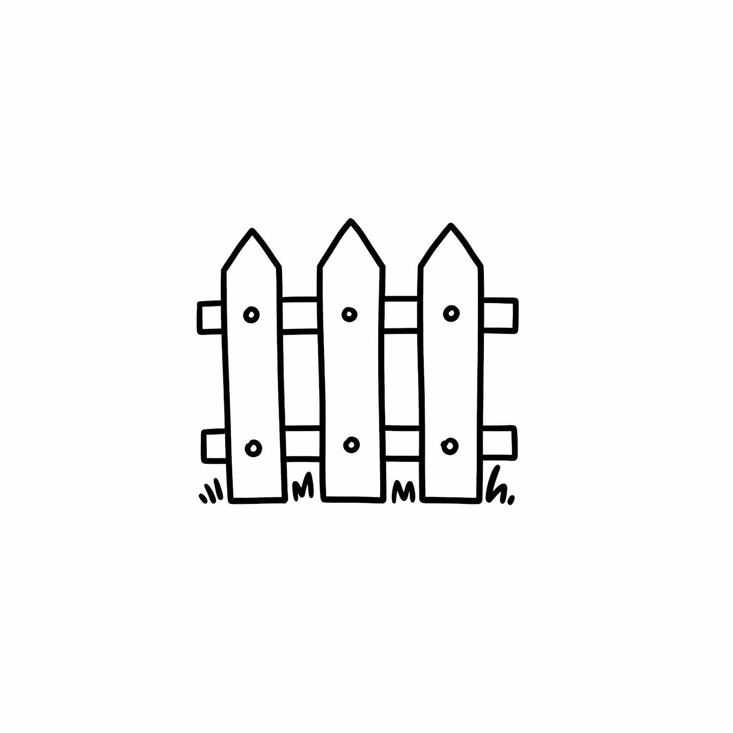 Minimalist black-and-white illustration of a wooden picket fence with pointed tops and grass details, perfect for design projects.