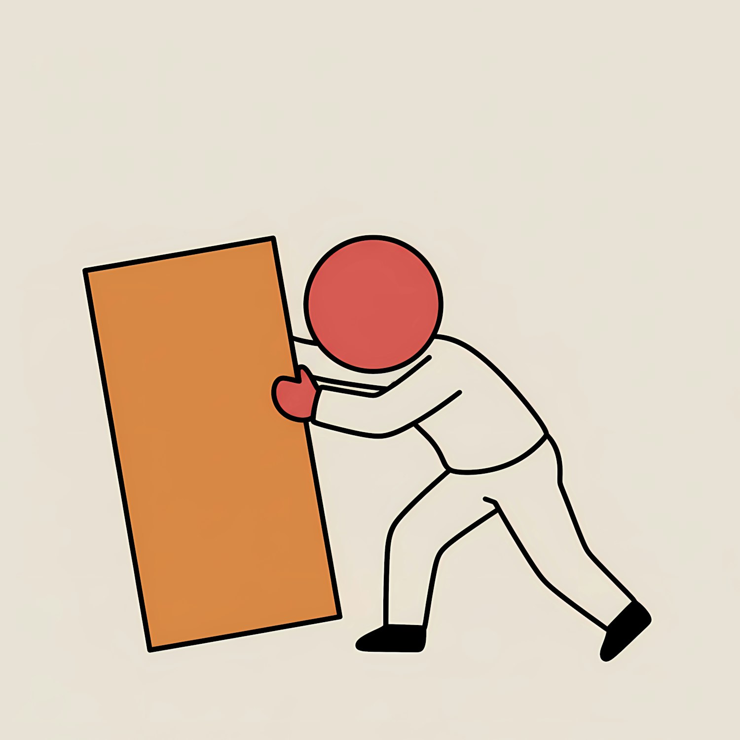 Minimalist illustration of a figure pushing an orange rectangle, featuring bold outlines and a clean, modern design.