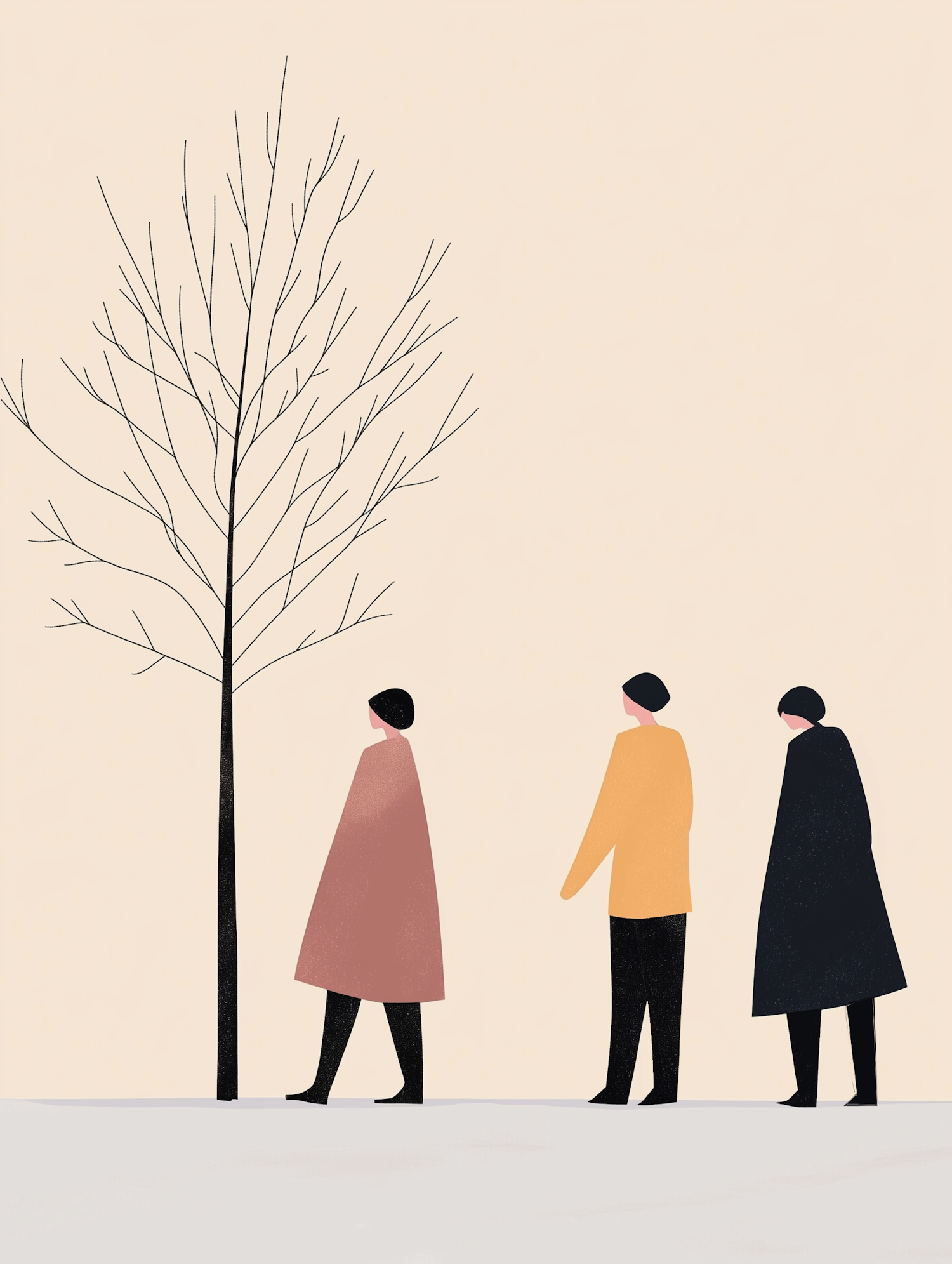 Minimalist illustration of three figures walking past a bare tree, wearing colorful coats against a beige background.