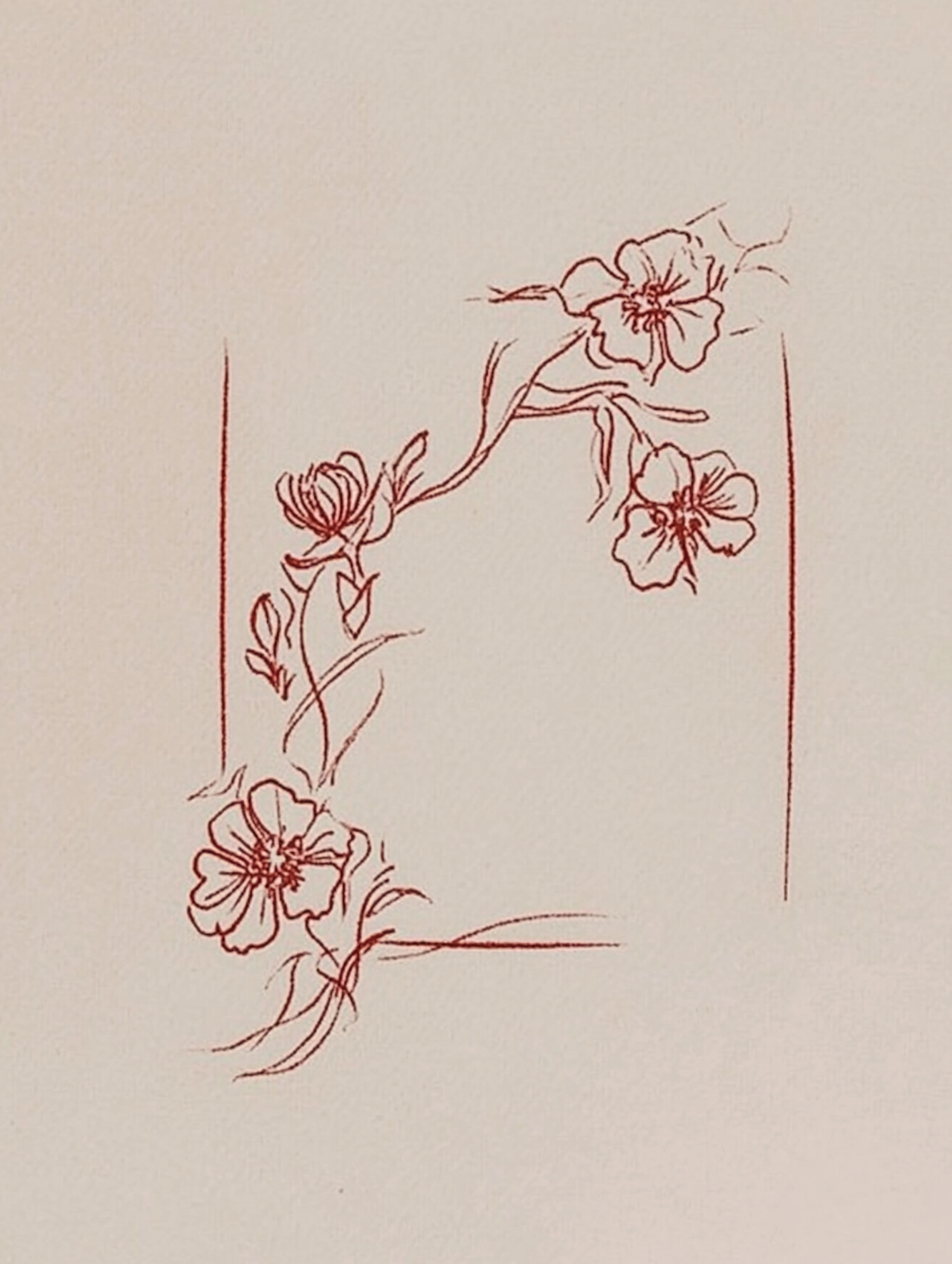 Minimalist red line art of flowers and leaves on a beige background, featuring delicate blossoms and stems in an elegant composition.