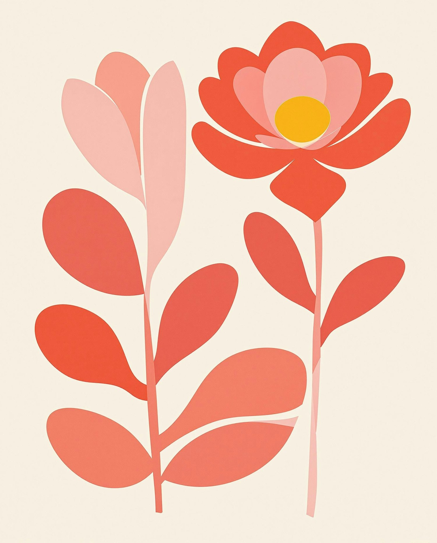 A modern, minimalist illustration of abstract red and pink flowers and leaves on a clean beige background.