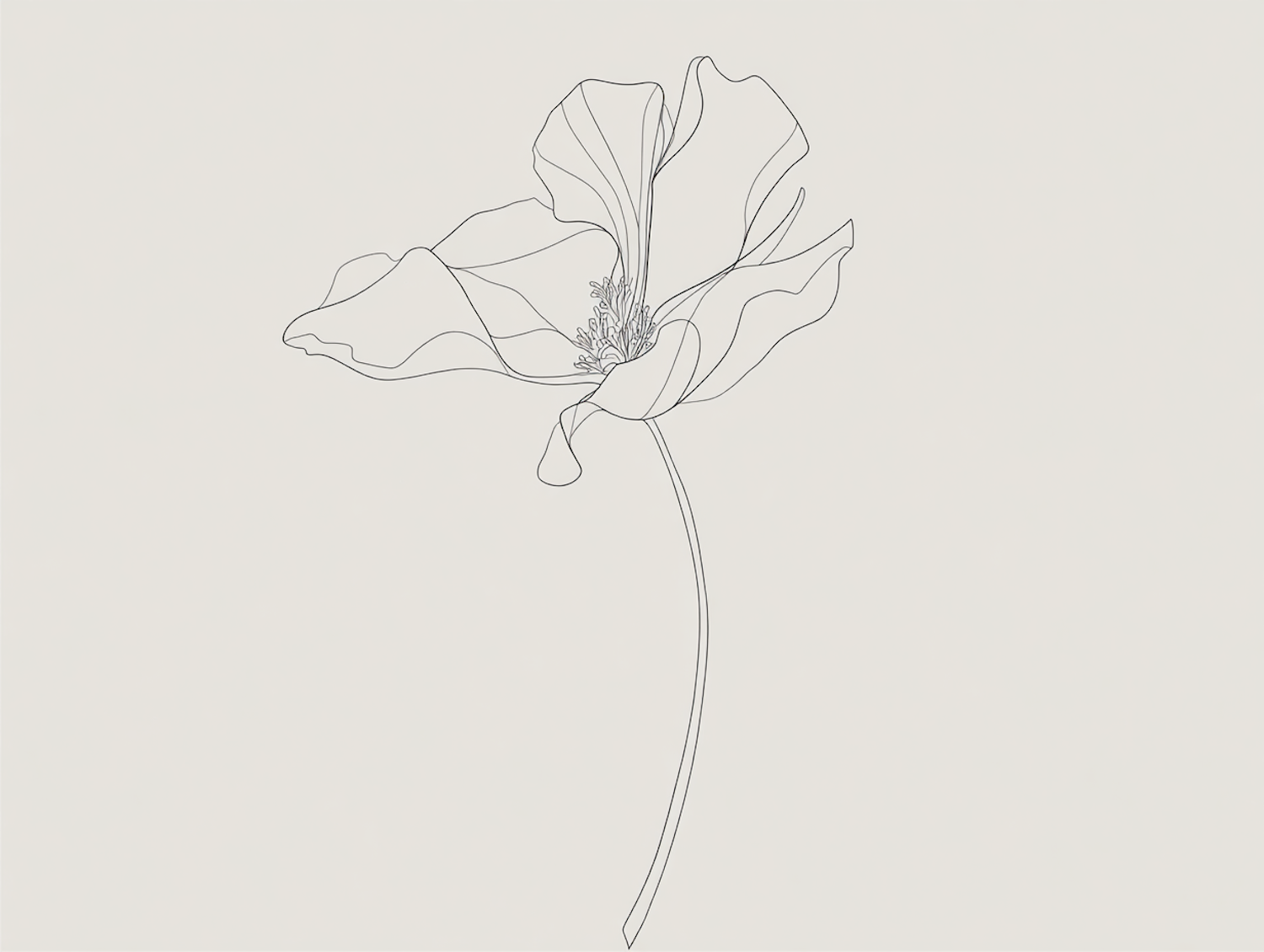 Elegant minimalist line drawing of a flower, artistically outlined in black on white background with highlighted details on petals and stamen.