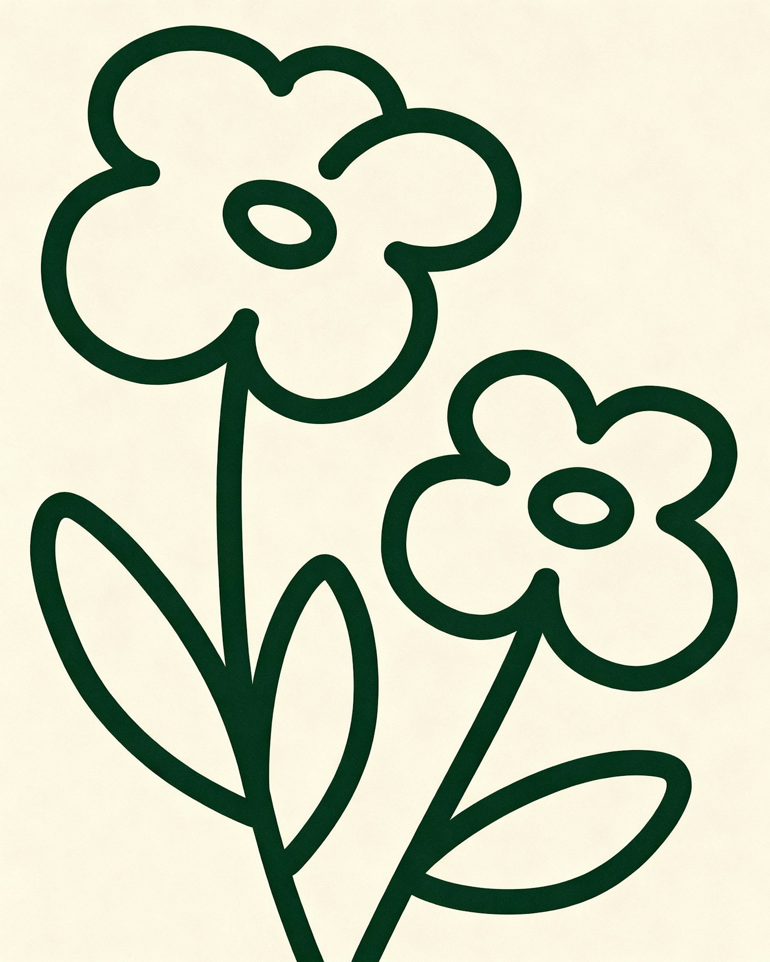 Minimalist illustration of two flowers with bold green outlines on a beige background, perfect for modern decor or design projects.
