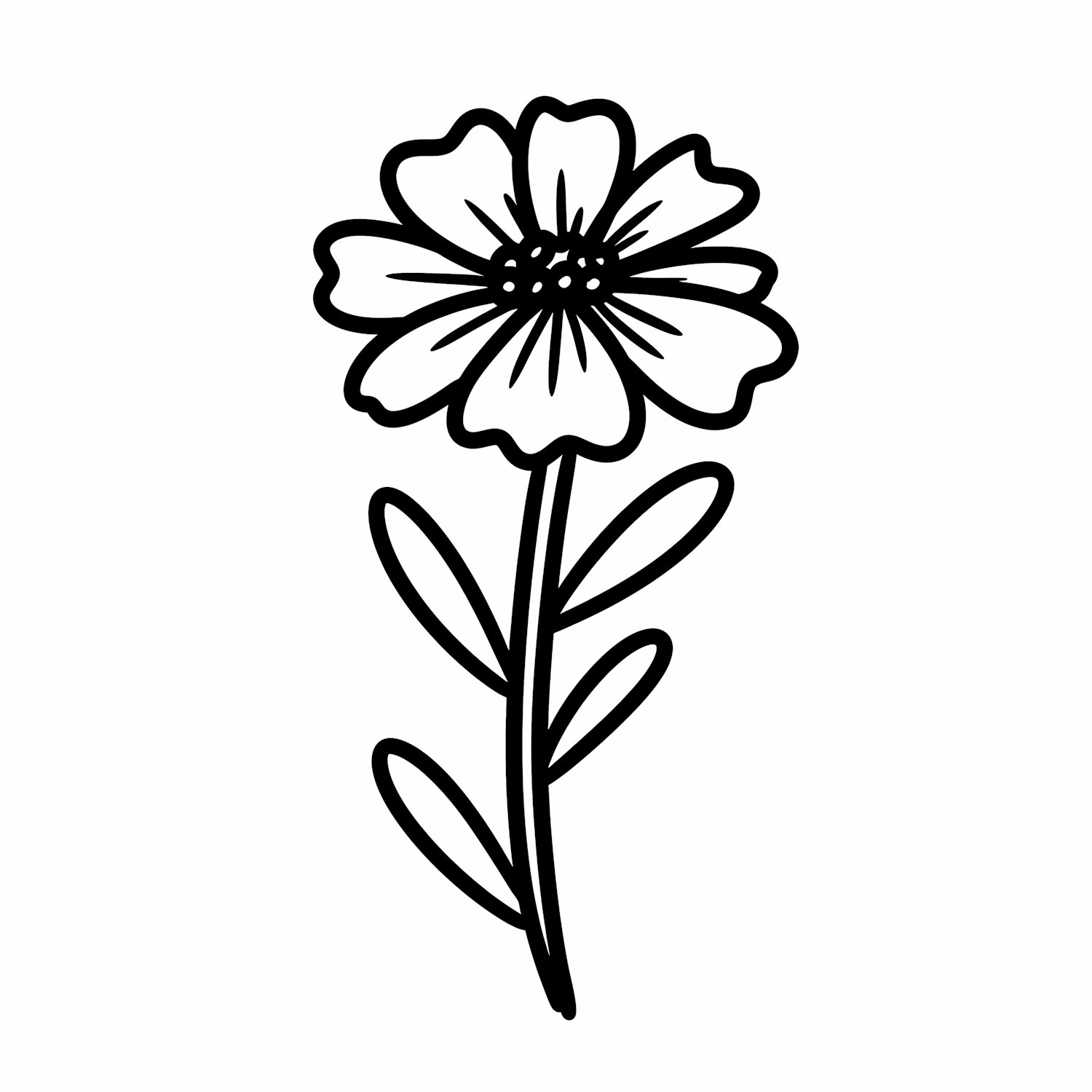 Minimalistic black-and-white line drawing of a flower with rounded petals and a simple stem with leaves.