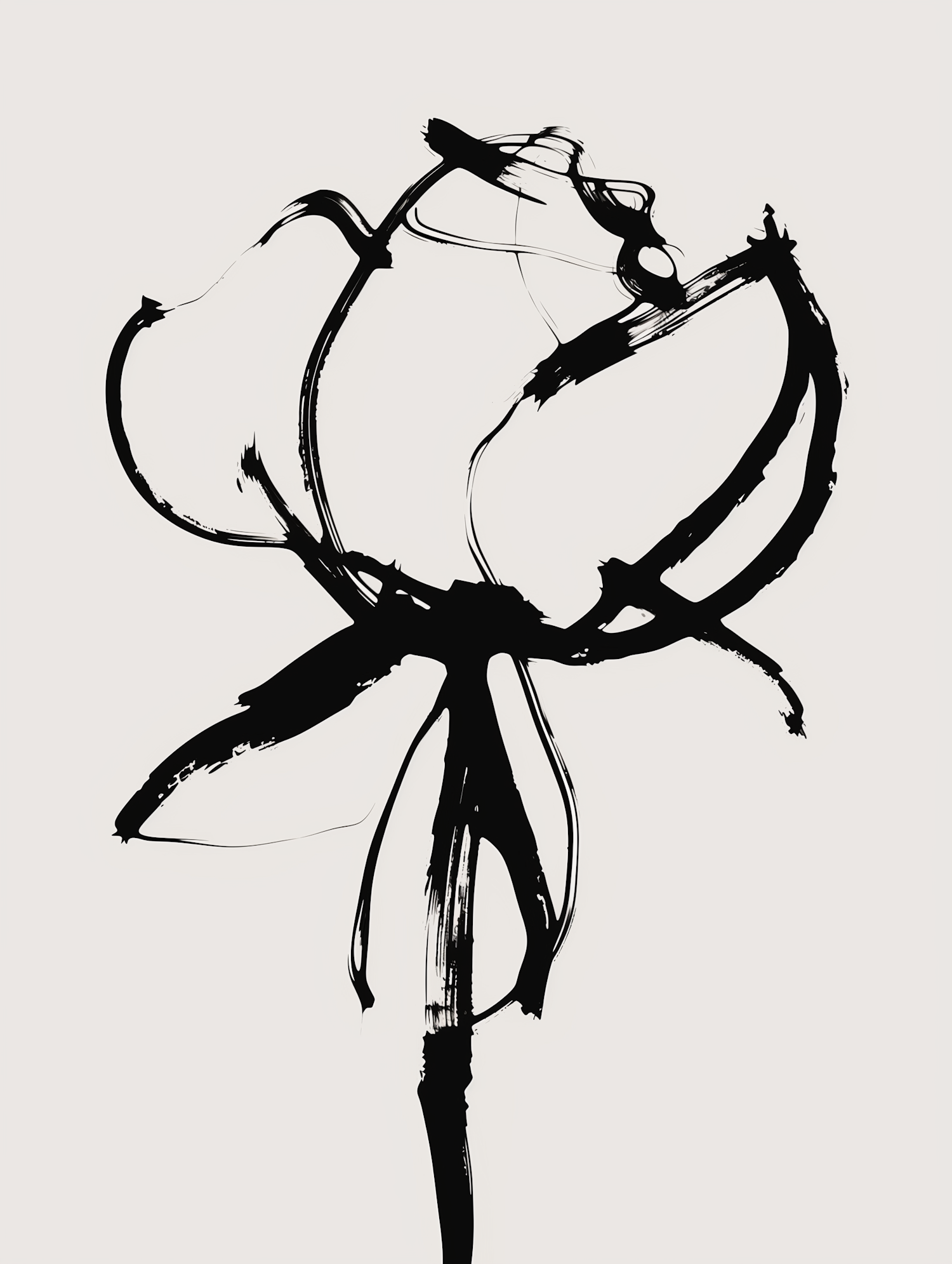 Minimalist black ink illustration of a flower with bold brushstrokes on a light beige background, evoking traditional sumi-e art.