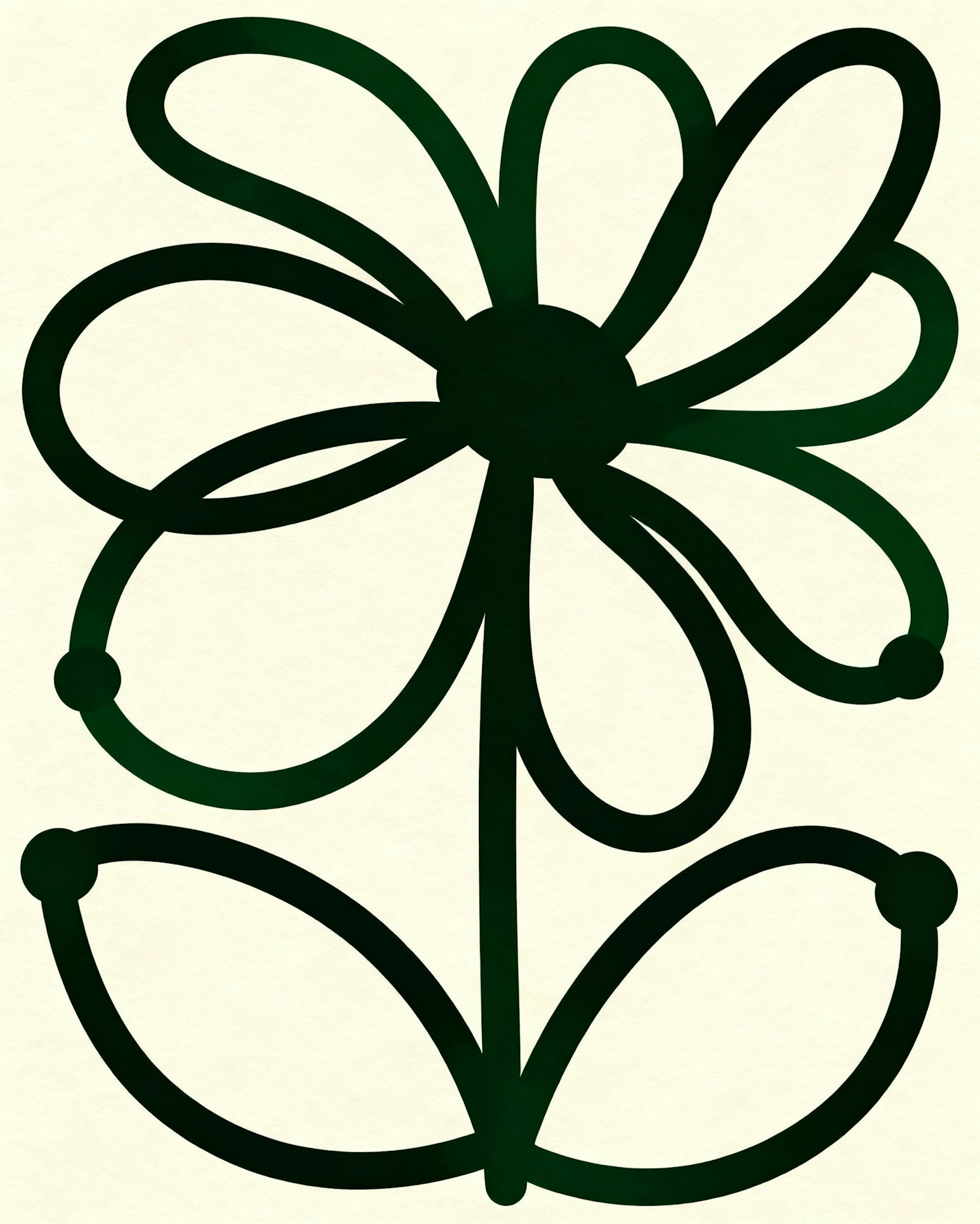 Bold minimalist floral illustration with very thick smooth monoline strokes, rounded ends, uniform line weight, hand-drawn but clean vector look, abstract flower shapes, overlapping petals, no shading, no texture, no gradients, flat colors, playful organic composition, modern graphic aesthetic. Big looping floral shapes drawn in thick expressive strokes. A simple, flowing arrangement with soft overlapping. Background in a warm creamy off-white, lines in a deep green-black, high contrast, no accents.