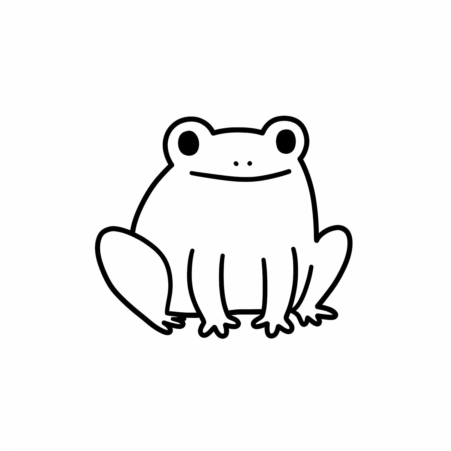 A minimalist black-and-white line drawing of a frog sitting with a cheerful expression, perfect for coloring or graphic design.