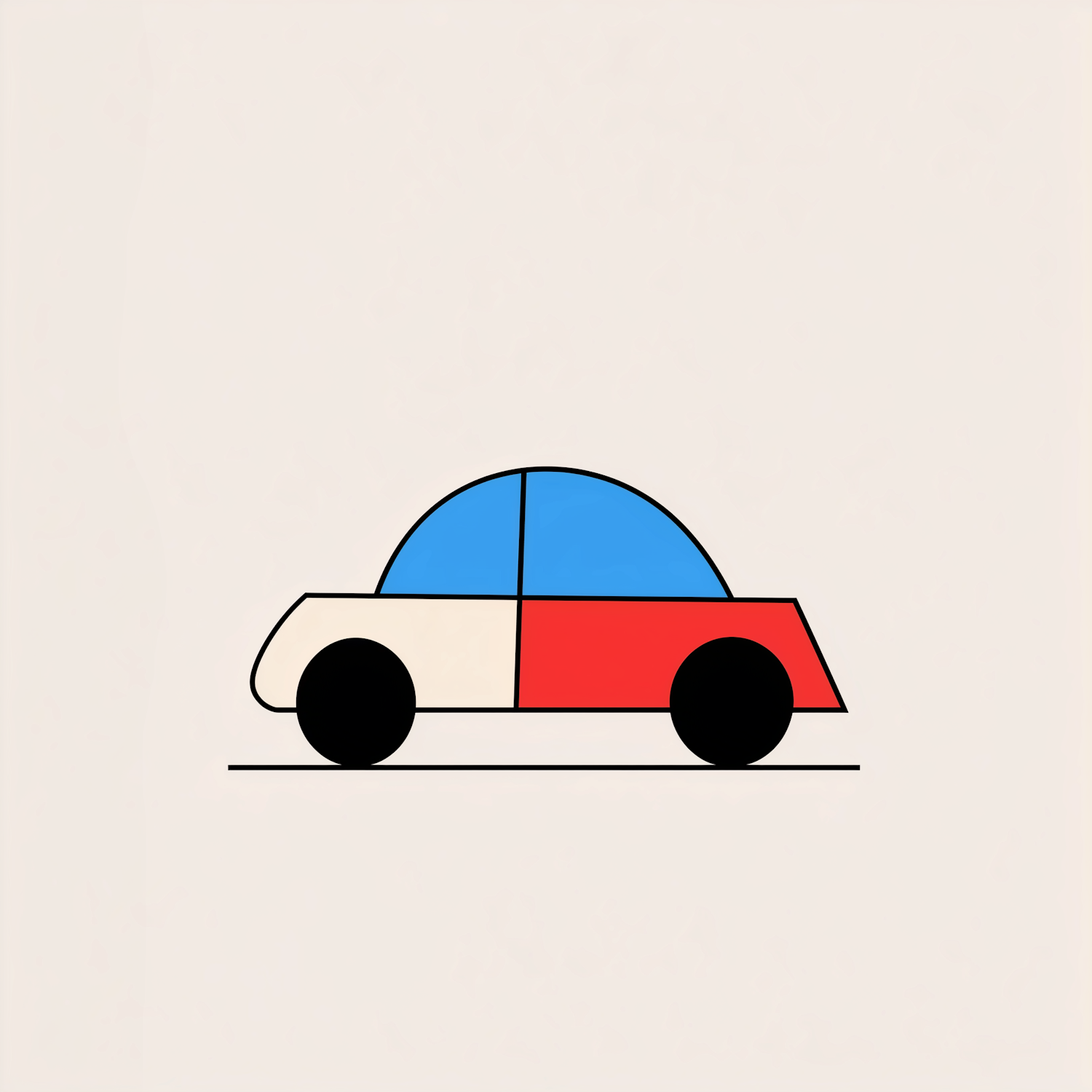 Minimalist car illustration with geometric shapes and primary colors: cream, blue, and red. Simple black wheels on an off-white background.