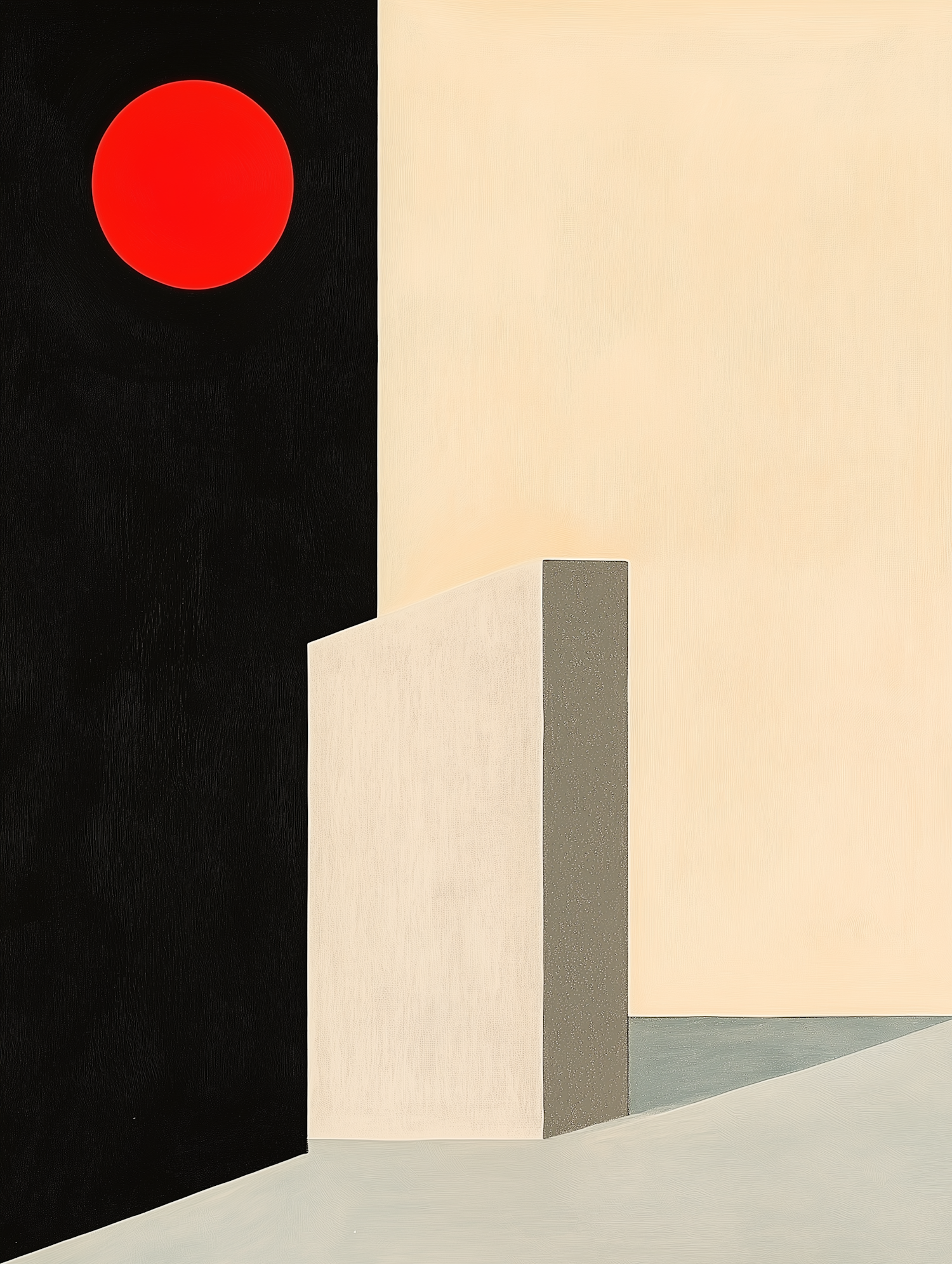 Minimalist abstract painting with bold geometric shapes, featuring a red circle on black and beige rectangles, creating a striking contrast.
