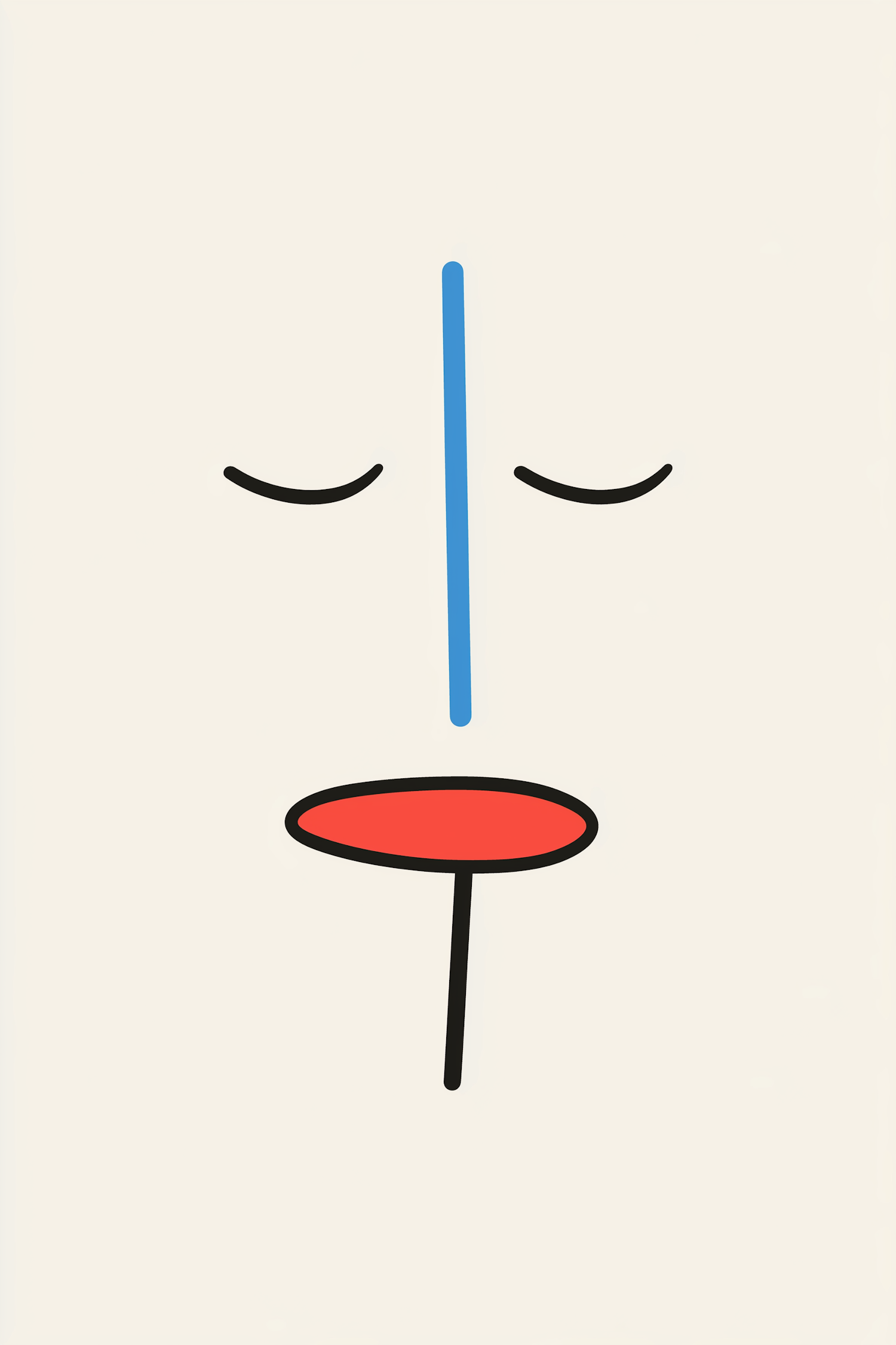 Minimalist face illustration with geometric shapes: blue line nose, red oval mouth, and black line eyes on an off-white background.
