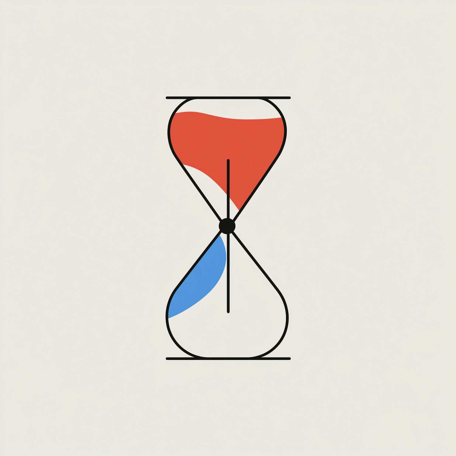 Minimalist hourglass illustration with red and blue sand on an off-white background, emphasizing modern geometric design.