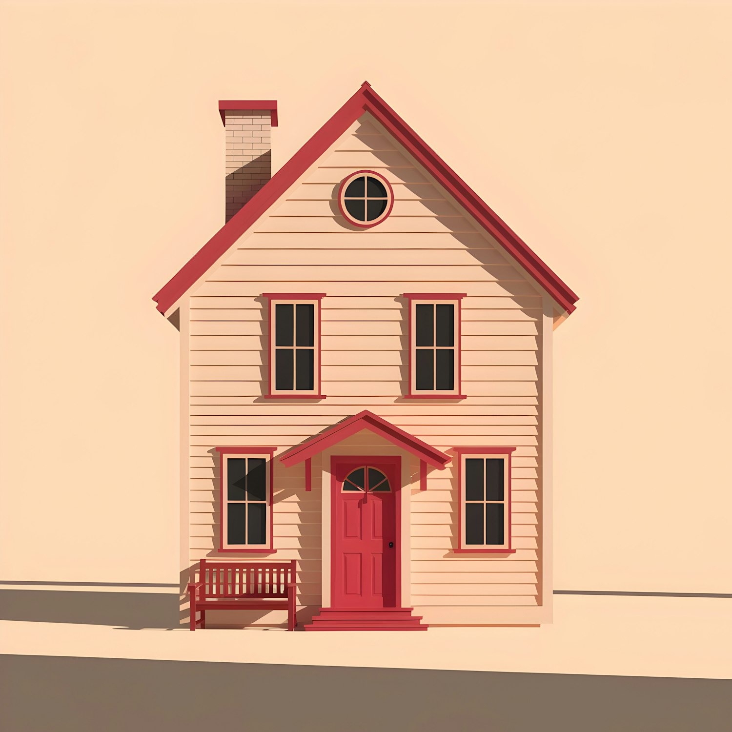 Minimalist illustration of a beige house with red accents, featuring a gable roof, circular window, and a cozy red bench by the door.