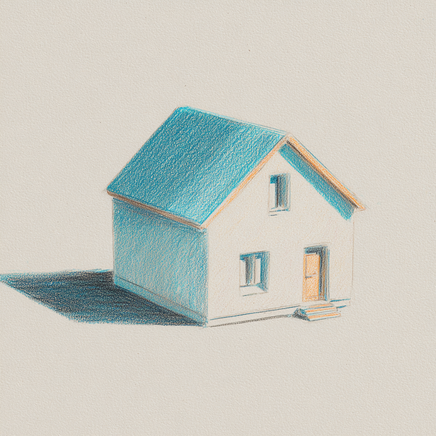 Minimalist colored pencil drawing of a small house with a blue roof and white walls, showcasing clean lines and soft shading.
