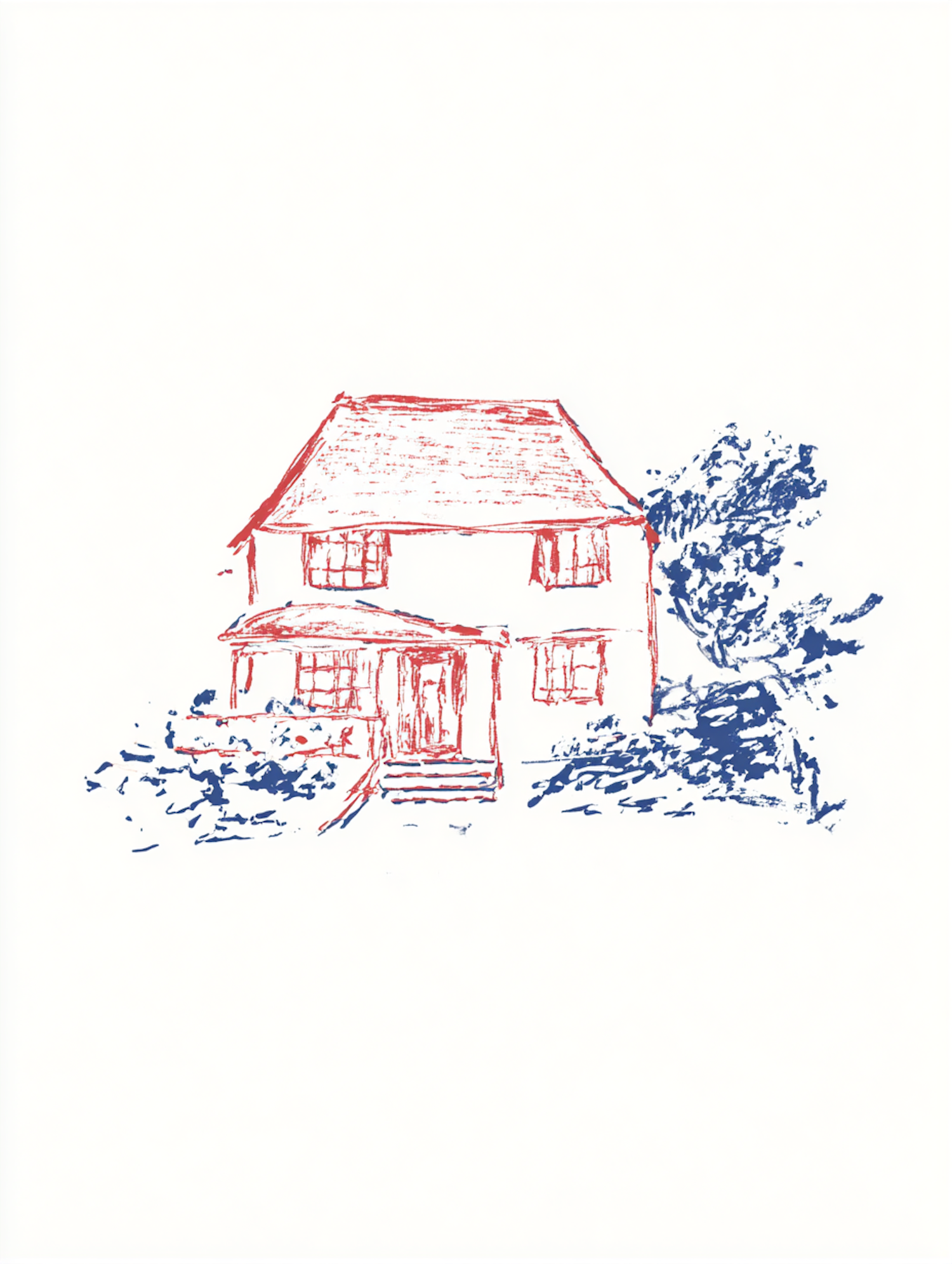 Minimalist red and blue ink sketch of a house with trees, featuring a simple and artistic design on a blank background.