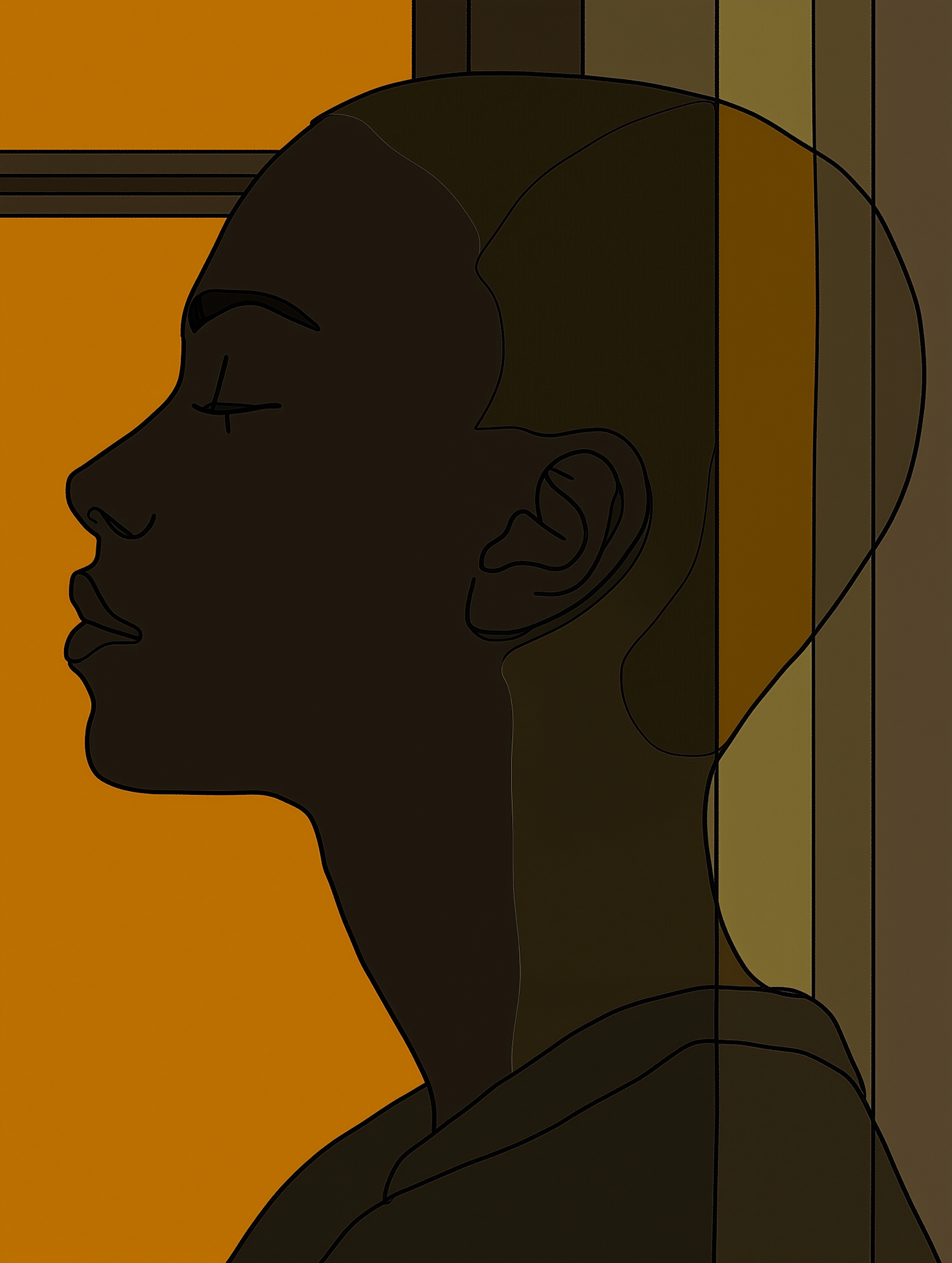 Stylized profile illustration of a person with dark skin, closed eyes, and a calm expression against a warm-toned background.