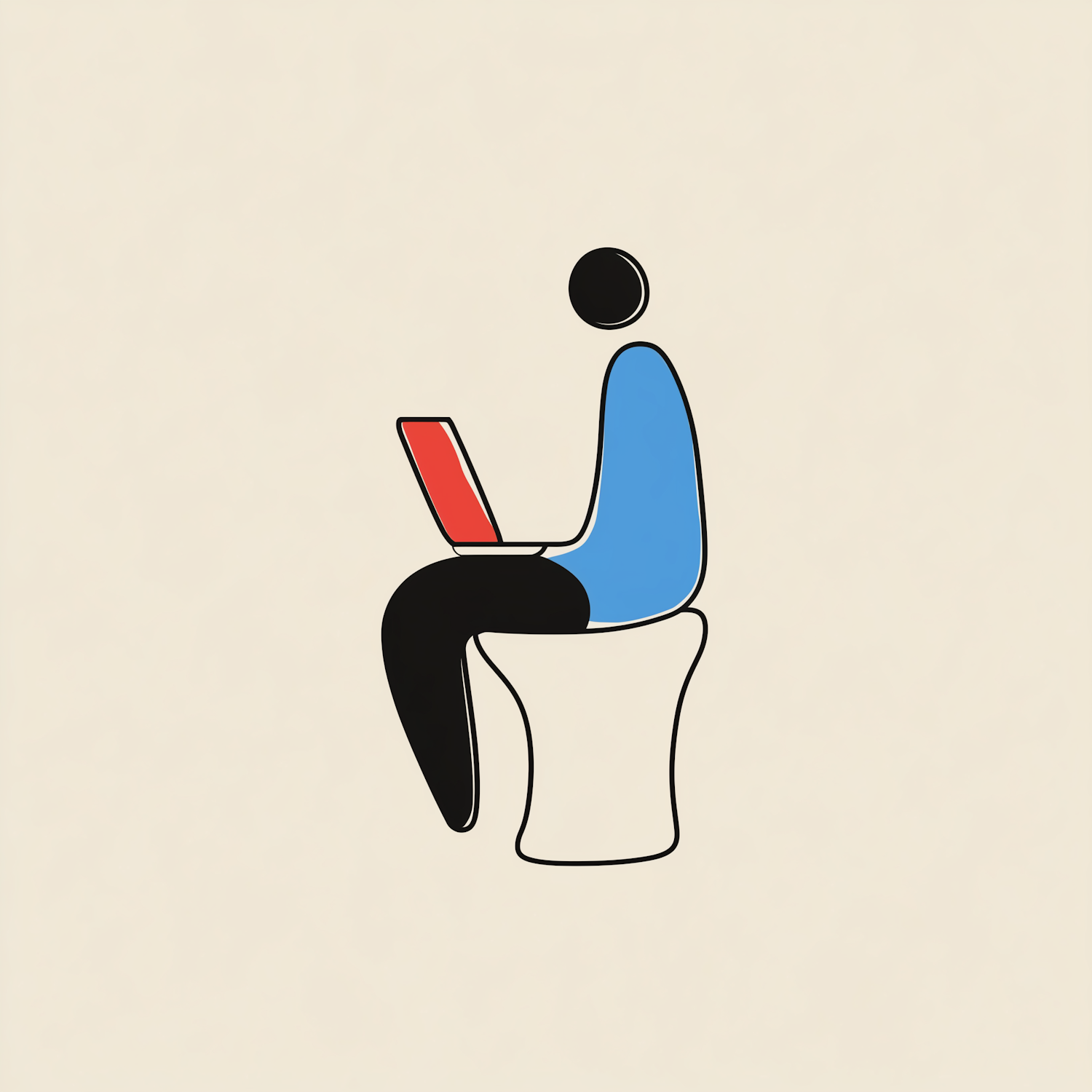 Minimalist illustration of a person using a laptop on a toilet, featuring simple shapes and bold colors for a modern, humorous touch.