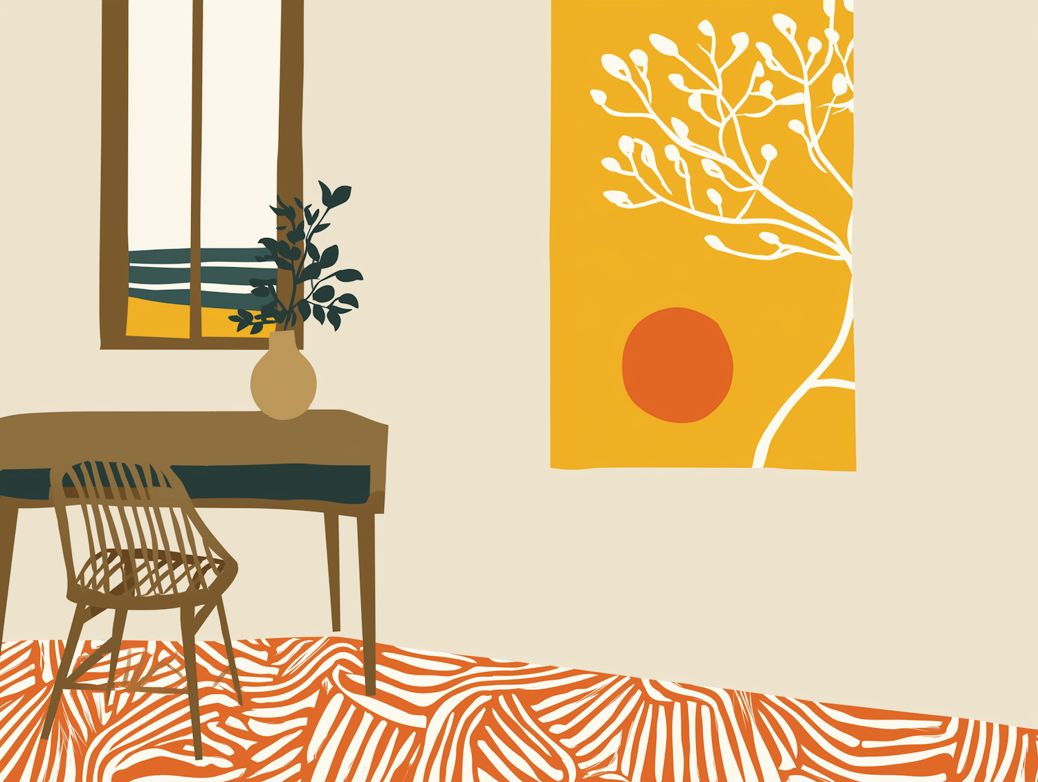 Minimalist interior illustration with a wooden desk, chair, vase, patterned rug, and bright yellow artwork featuring a tree and sun.