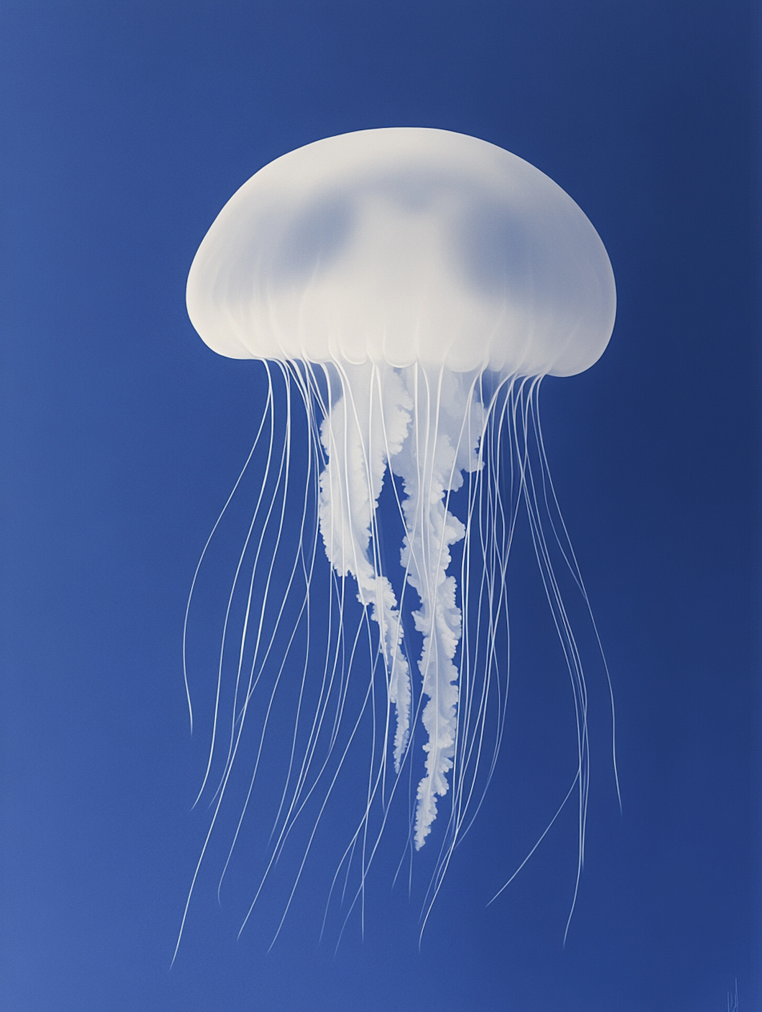 A stunning minimalist illustration of a white jellyfish with flowing tentacles on a vibrant blue background, evoking oceanic serenity.