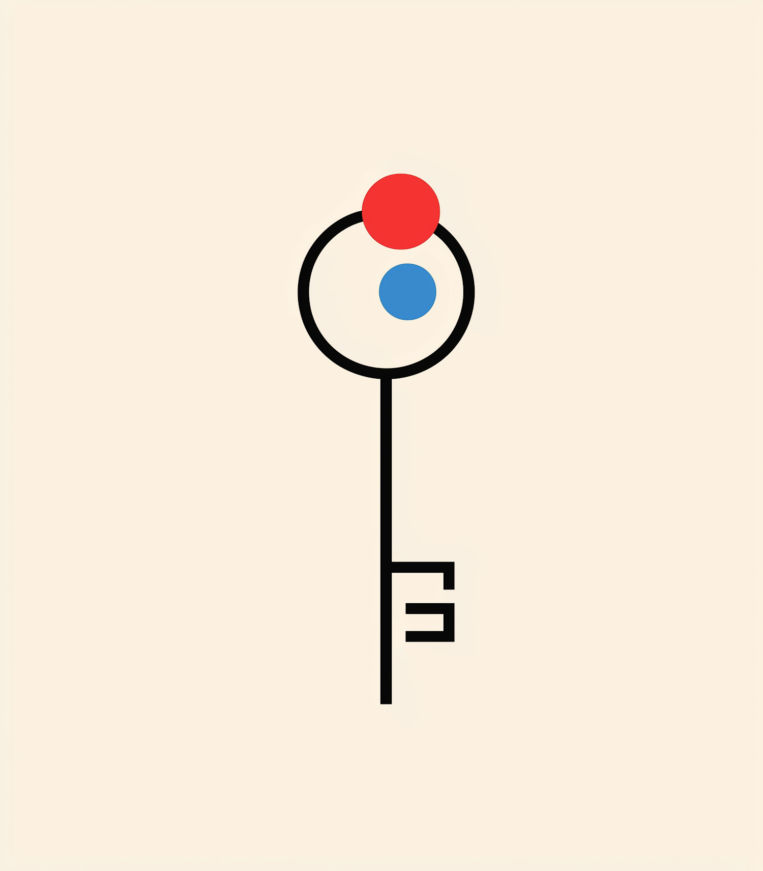 Minimalist key illustration with red and blue circles on a beige background, emphasizing geometric shapes and primary colors.