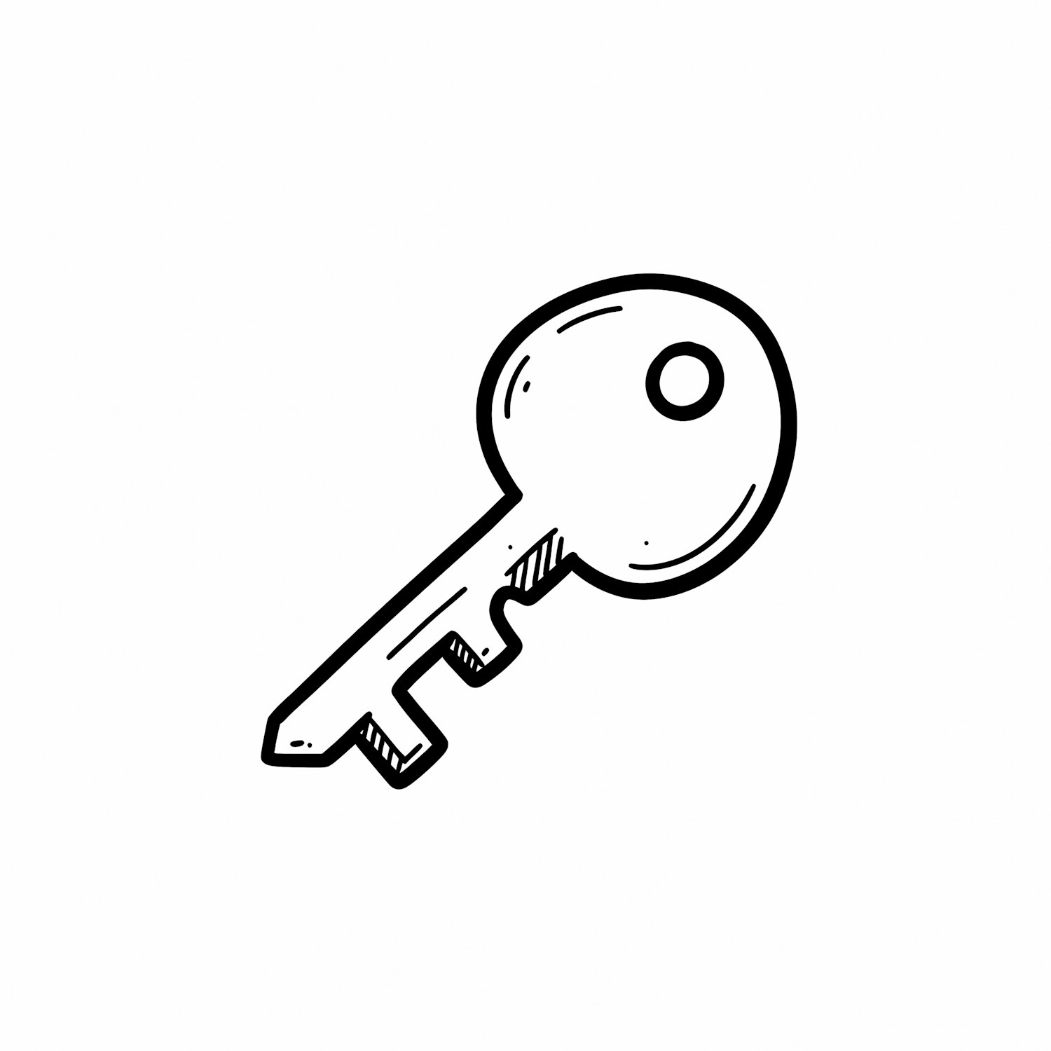 Minimalist black-and-white illustration of a traditional key with a round head and notched blade on a plain white background.