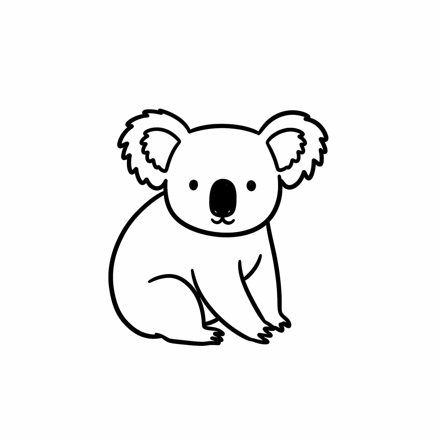 Minimalistic black-and-white line drawing of a seated koala with fluffy ears and a small nose, perfect for coloring or design projects.