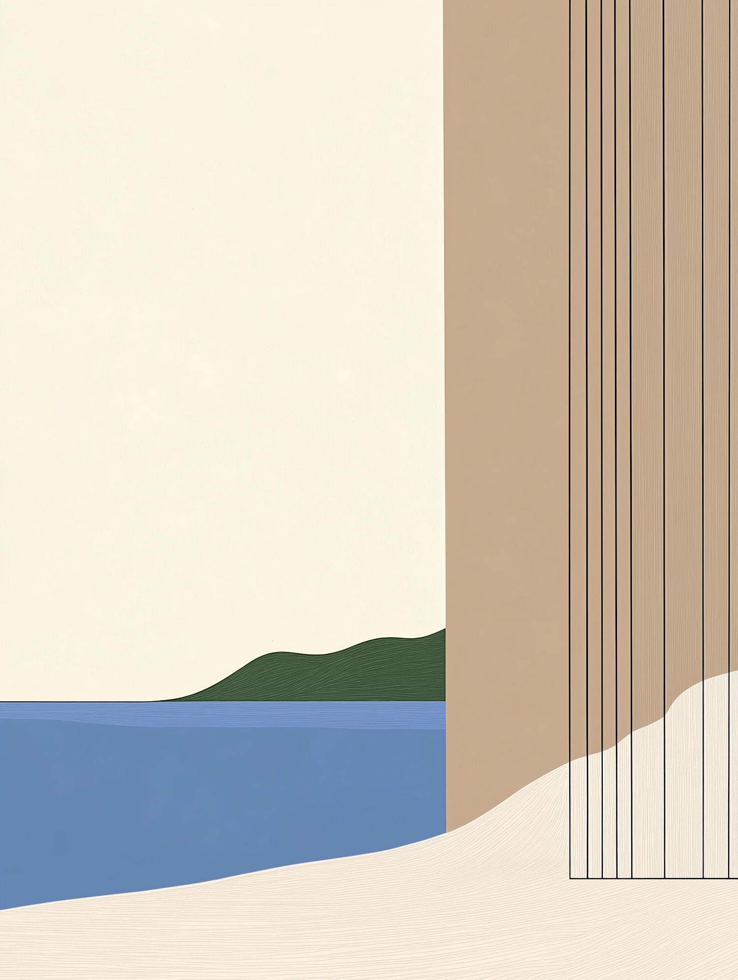 Minimalist landscape illustration with blue water, green hills, and a beige abstract structure. Modern and serene design.