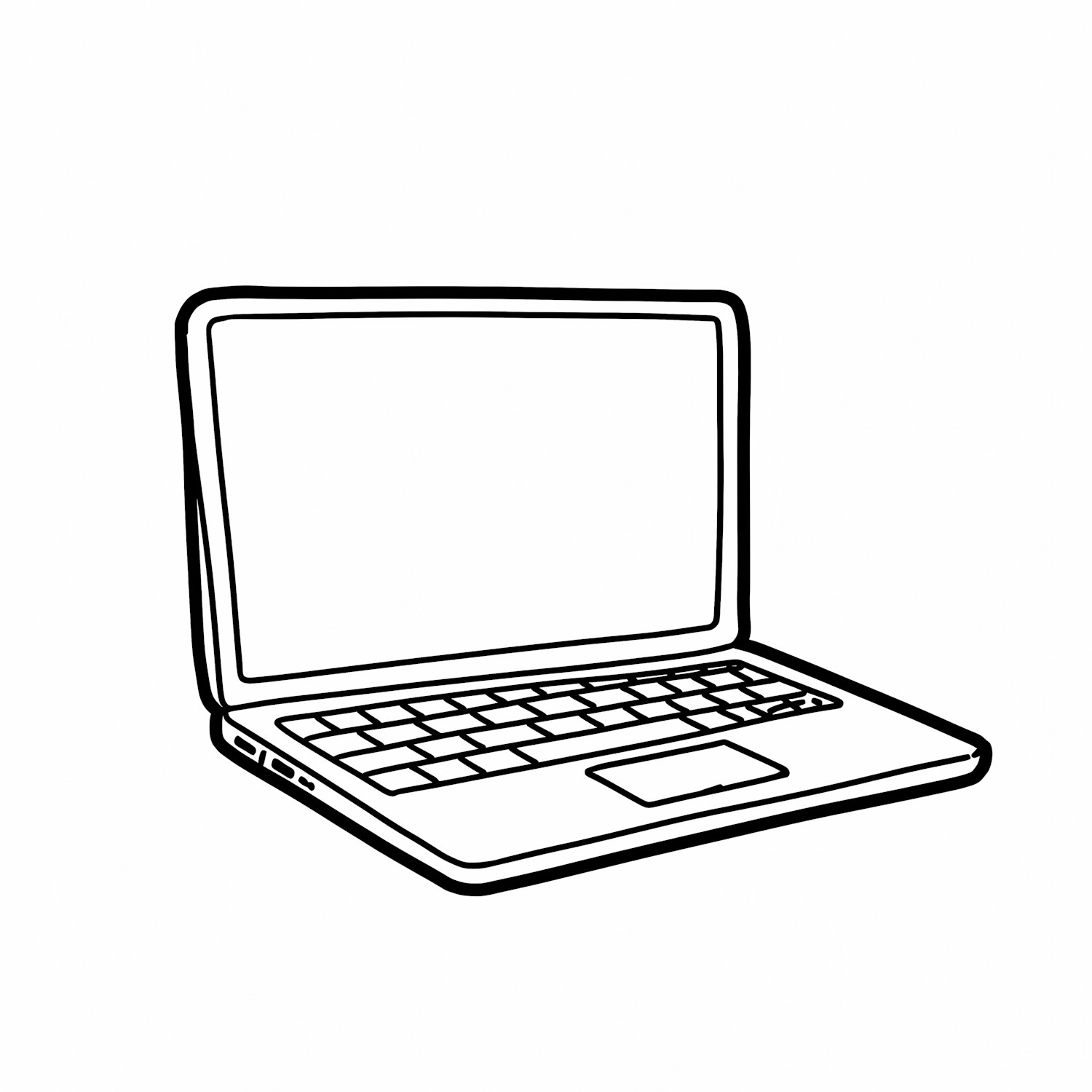 Minimalistic black-and-white line drawing of an open laptop, showcasing its screen and keyboard in a clean, simple style.