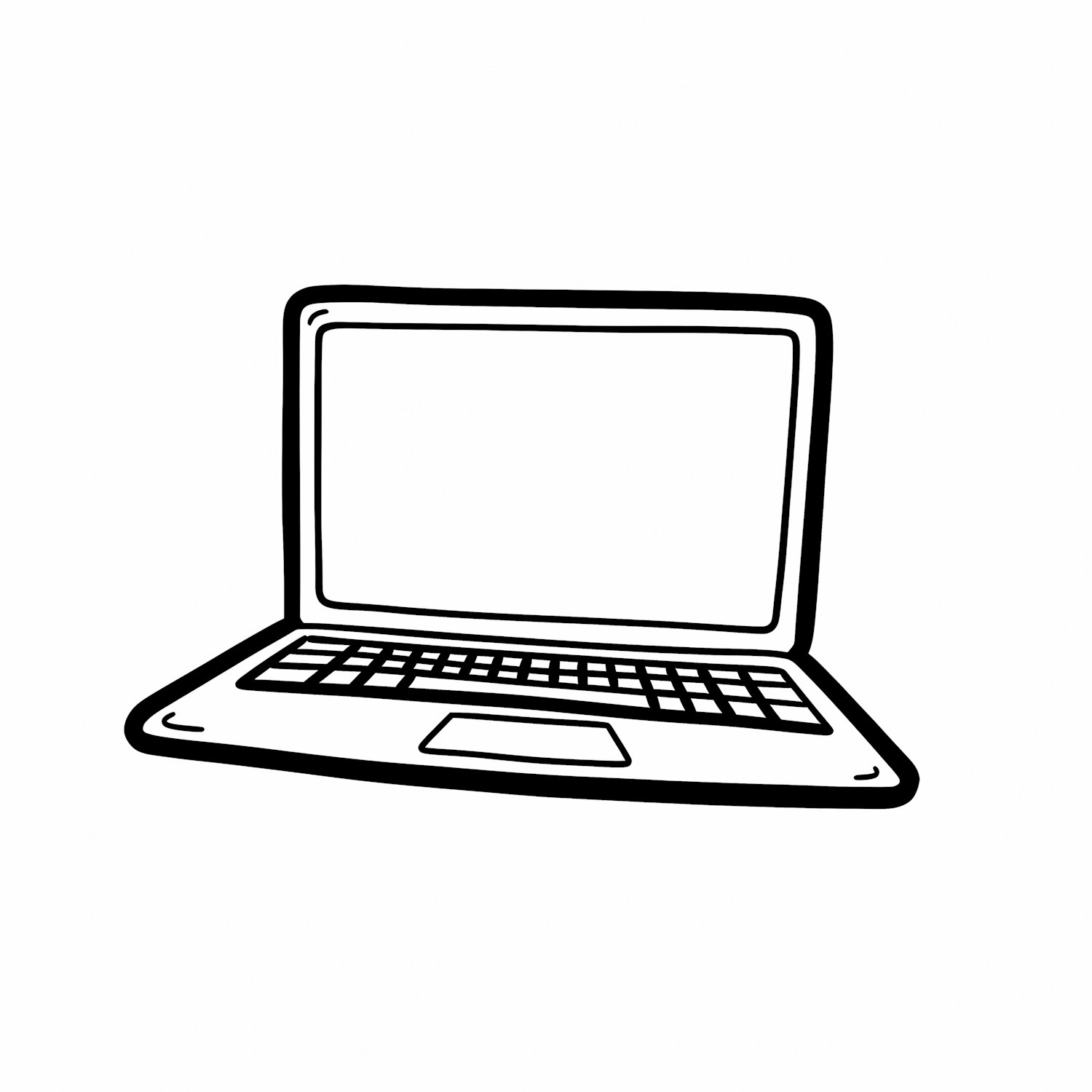 Minimalistic black-and-white line drawing of a laptop with a screen, keyboard, and touchpad, perfect for tech-related designs.