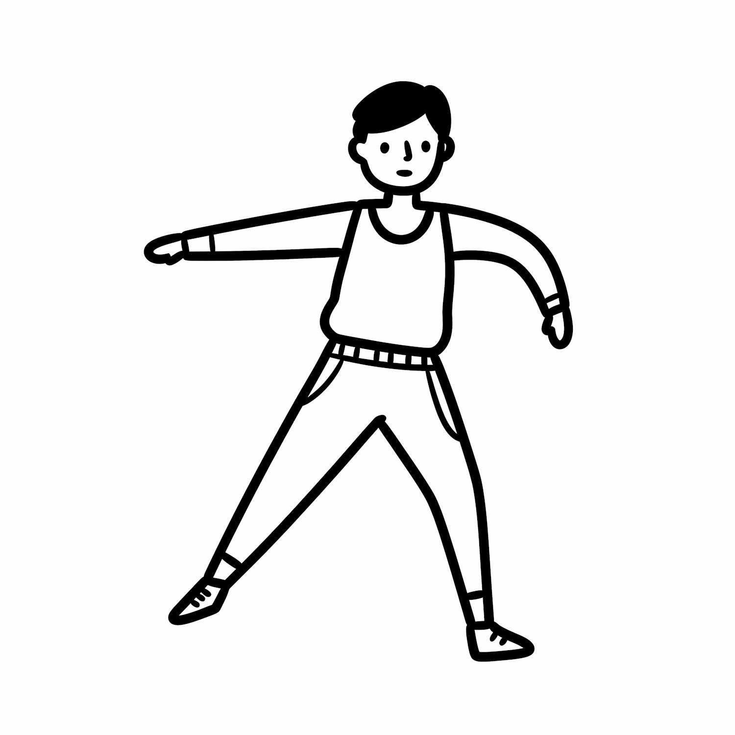 Minimalistic black-and-white line art of a person in a sleeveless top and pants, standing with arms outstretched.