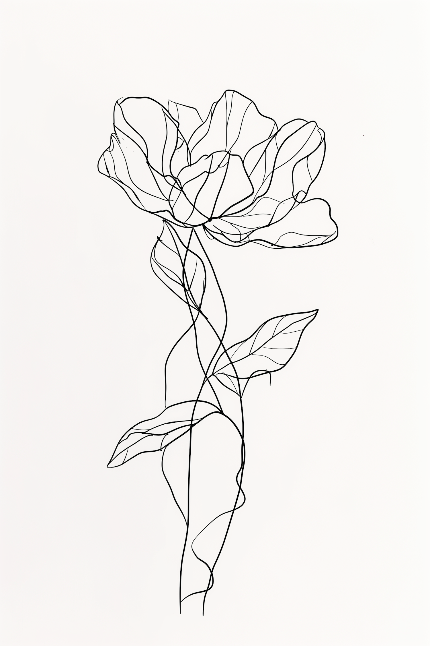 Minimalist line drawing of a flower with flowing petals and leaves, emphasizing simplicity and elegance.