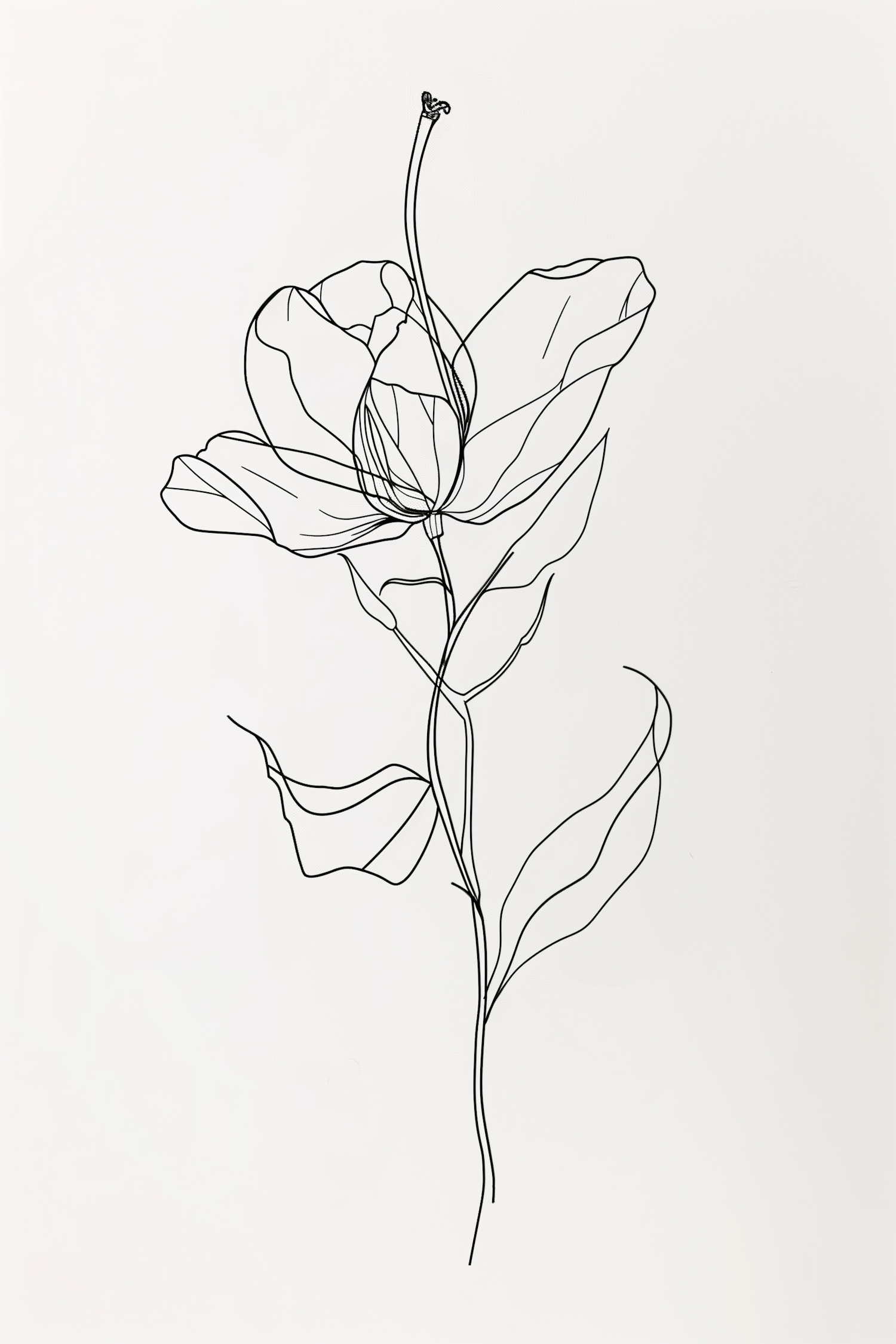 Minimalist line drawing of a flower with elegant petals and leaves on a plain white background.