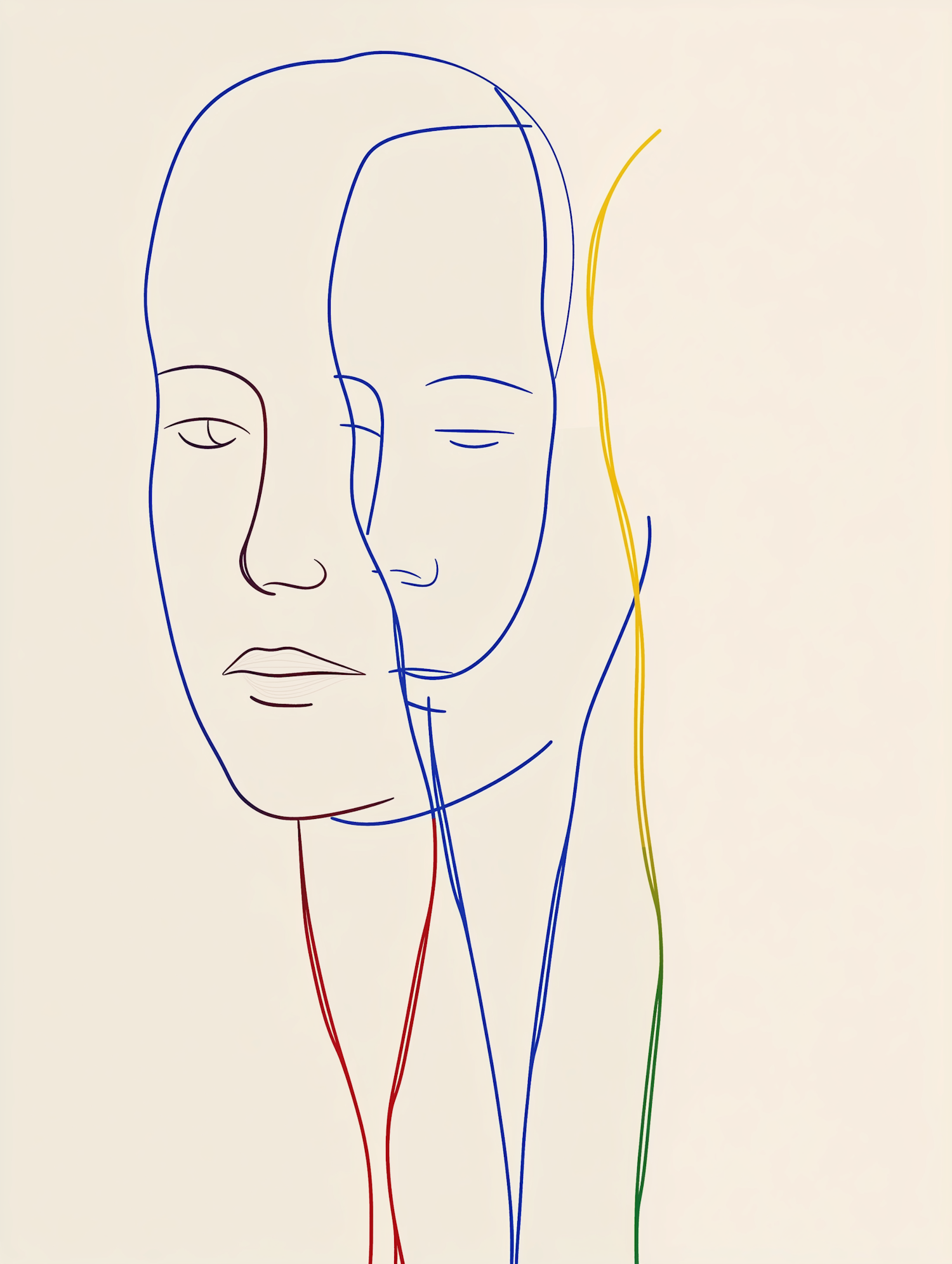 Minimalist line art of a human face with colorful lines on a beige background, evoking calmness and abstraction.