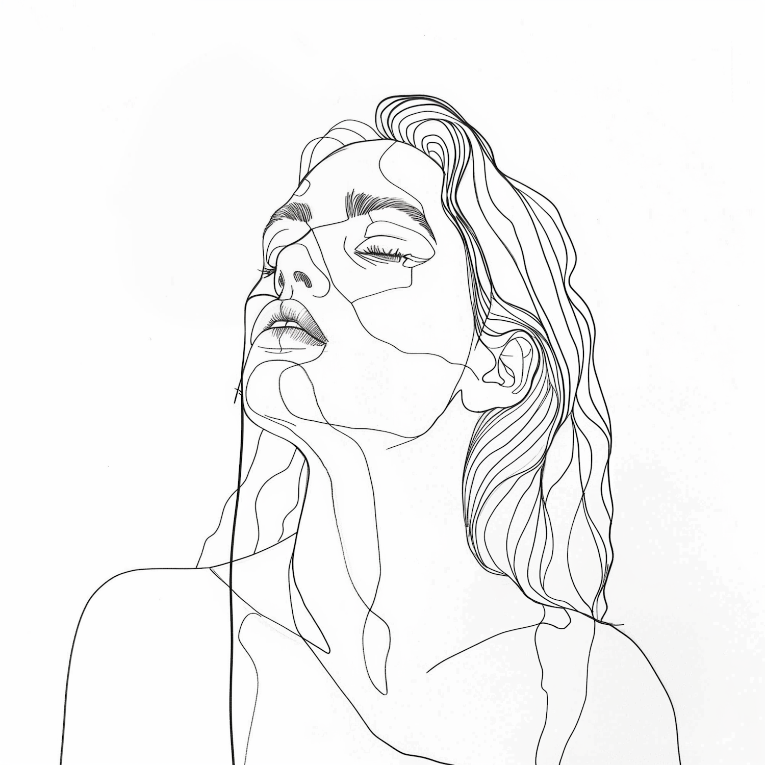 Minimalist line art of a woman's face with closed eyes, head tilted back, and flowing hair. Elegant and abstract design.