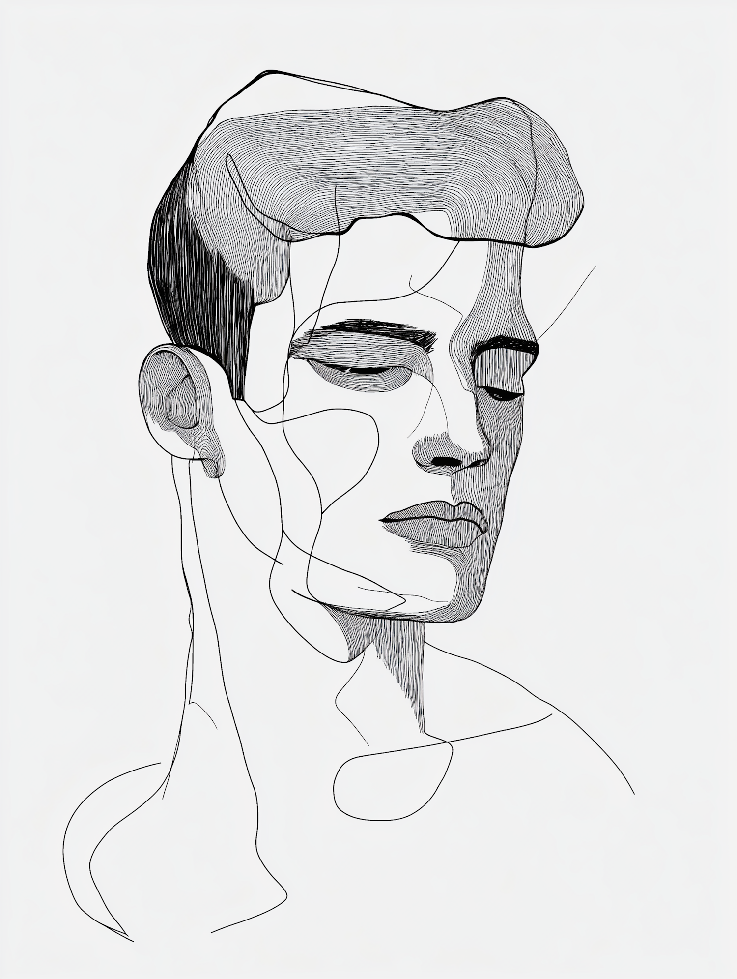 Abstract line drawing of a male face with closed eyes, featuring minimalist and continuous lines for a serene expression.