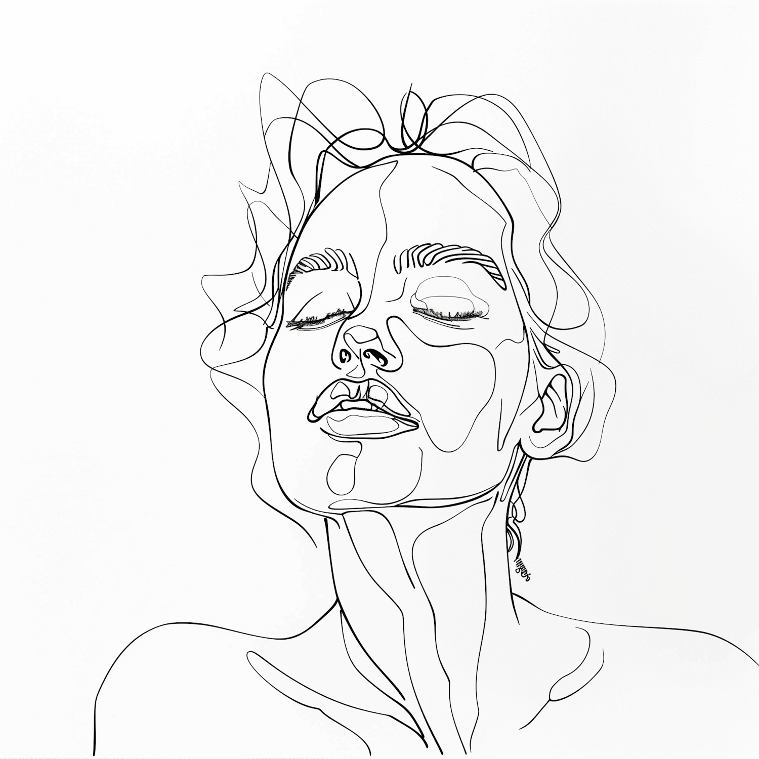 Minimalist line drawing of a serene woman with closed eyes, capturing elegance and tranquility in fluid, continuous lines.
