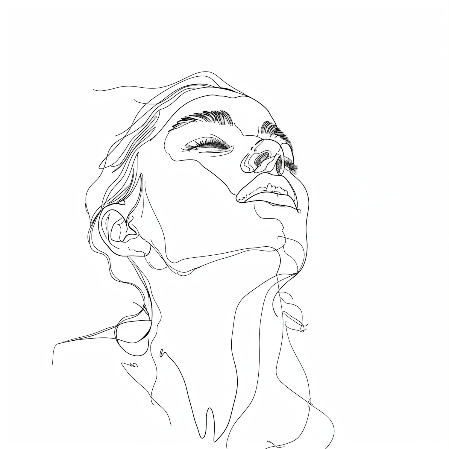 Minimalist line art of a serene face with closed eyes and flowing hair, capturing elegance and simplicity.