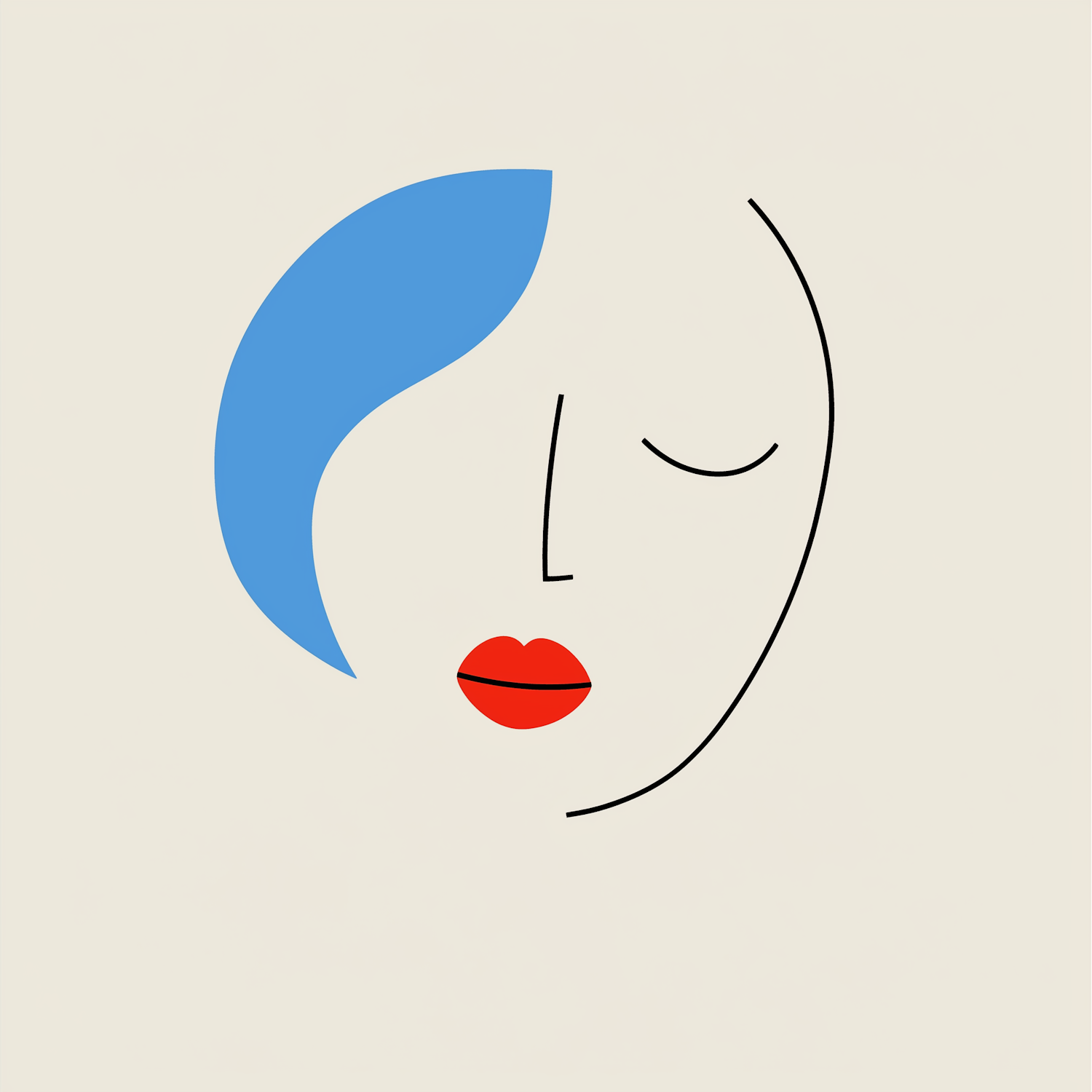 Minimalist abstract face illustration with bold red lips, blue hair, and soft beige background, emphasizing simplicity and elegance.