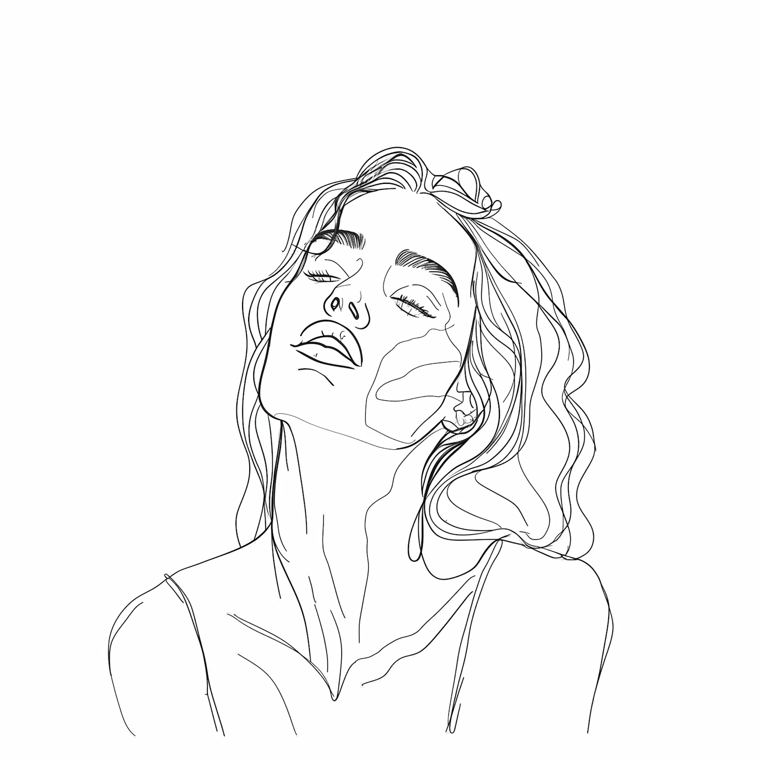 Minimalist line drawing of a woman with closed eyes and relaxed expression, showcasing elegance and simplicity.